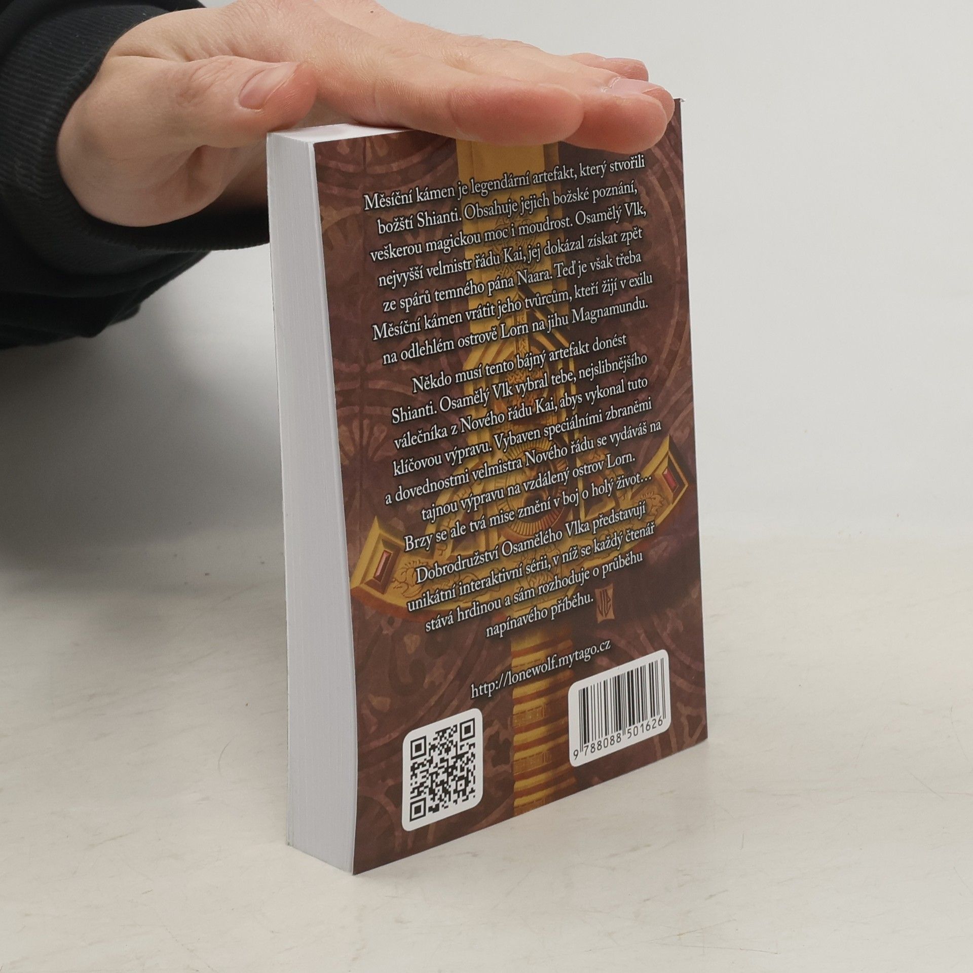 Další dobrodružný příběh LoneWolfa ze stejnojmenné série gamebooků. Měsíční kámen je legendární artefakt, který stvořili božští Shianti. Obsahuje jejich božské poznání, veškerou magickou moc i moudrost. Osamělý Vlk, nejvyšší velmistr řádu Kai, jej dokázal získat zpět ze spárů temného pána Naara. Teď je však třeba Měsíční kámen vrátit jeho tvůrcům, kteří žijí v exilu na odlehlém ostrově Lorn na jihu Magnamundu. Nakladatelská anotace. Kráceno.