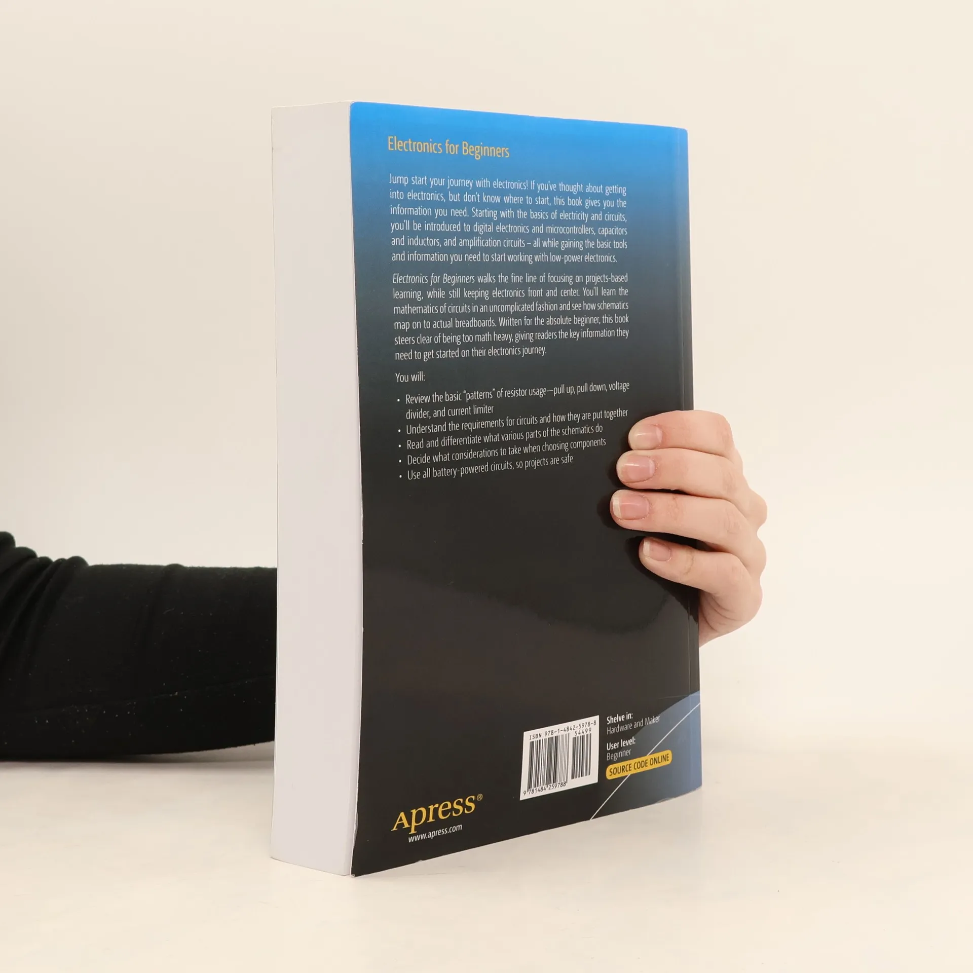 Jump start your journey with electronics! If you've thought about getting into electronics, but don't know where to start, this book gives you the information you need. Starting with the basics of electricity and circuits, you'll be introduced to digital electronics and microcontrollers, capacitors and inductors, and amplification circuits - all while gaining the basic tools and information you need to start working with low-power electronics. Electronics for Beginners walks the fine line of focusing on projects-based learning, while still keeping electronics front and center. You'll learn the mathematics of circuits in an uncomplicated fashion and see how schematics map on to actual breadboards. Written for the absolute beginner, this book steers clear of being too math heavy, giving readers the key information they need to get started on their electronics journey. What You'll Learn Review the basic "patterns" of resistor usage--pull up, pull down, voltage divider, and current limiter Understand the requirements for circuits and how they are put together Read and differentiate what various parts of the schematics do Decide what considerations to take when choosing components Use all battery-powered circuits, so projects are safe Who This Book Is For Makers, students, and beginners of any age interested in getting started with electronics.
