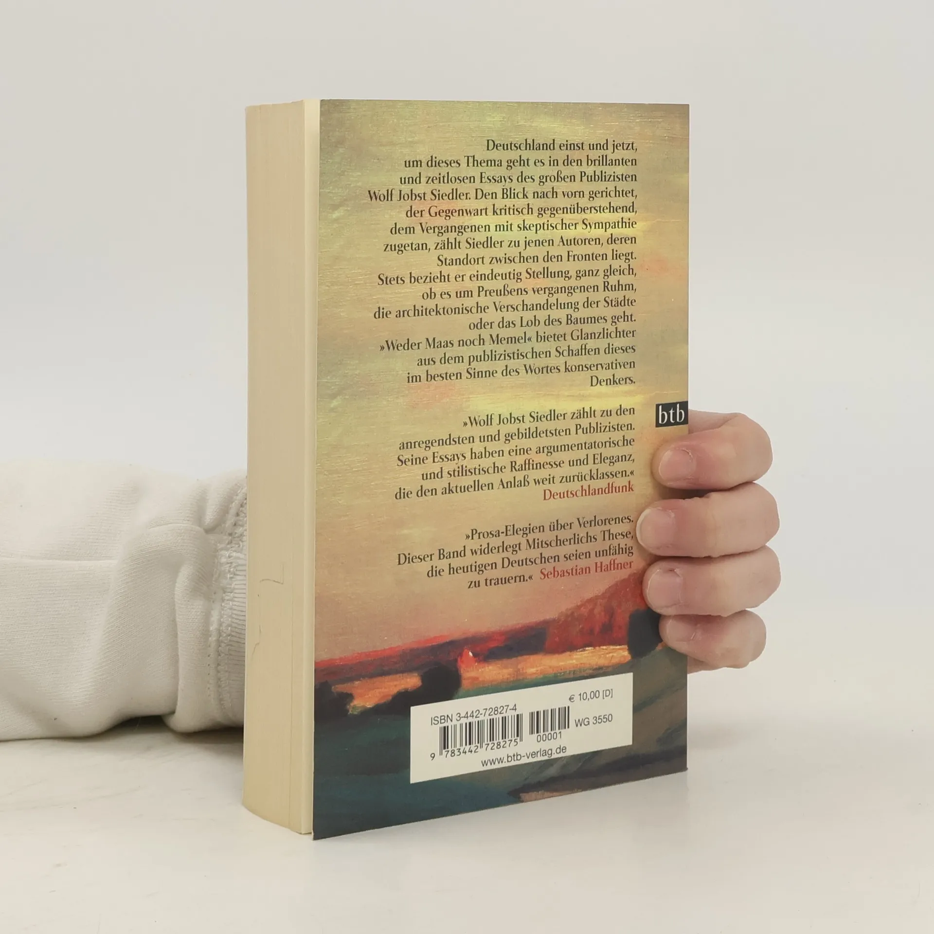 Zwei so unterschiedliche Blätter wie die „Frankfurter Allgemeine Zeitung“ und „Die Zeit“ haben Wolf Jobst Siedler einen „linken Tory“ genannt, und vermutlich trifft das Ausgangspunkt und Richtung seines Denkens ziemlich genau. Das Zukünftige wollend, der Gegenwart kritisch gegenüberstehend, dem Gewesenen mit skeptischer Anhänglichkeit zugetan, zählt er zu jenen Autoren, deren Standort zwischen den Fronten liegt. Das mag daran liegen, dass ihm der Abschied stets deutlich gewesen ist, den es von Vertrautem zu nehmen gilt – vom eigenen Land in der Gestalt des Reiches zwischen Maas und Memel, von den Provinzen, die im Osten versunken sind, von den Städten und Landschaften, die dem Glück der Gegenwart geopfert wurden. So hält sich Siedler an dem Bleibenden fest, Bäumen, Häusern, Vergangenheiten. Der Essay zur Verteidigung des Baumes zum Beispiel wurde in einer Zeit geschrieben, als es Grüne und Ökologen noch nicht gab. Zeitlosigkeit jenseits aller Tagesaktualität zeichnet die in diesem Band geeinten Texte des großen Publizisten Wolf Jobst Siedler aus.