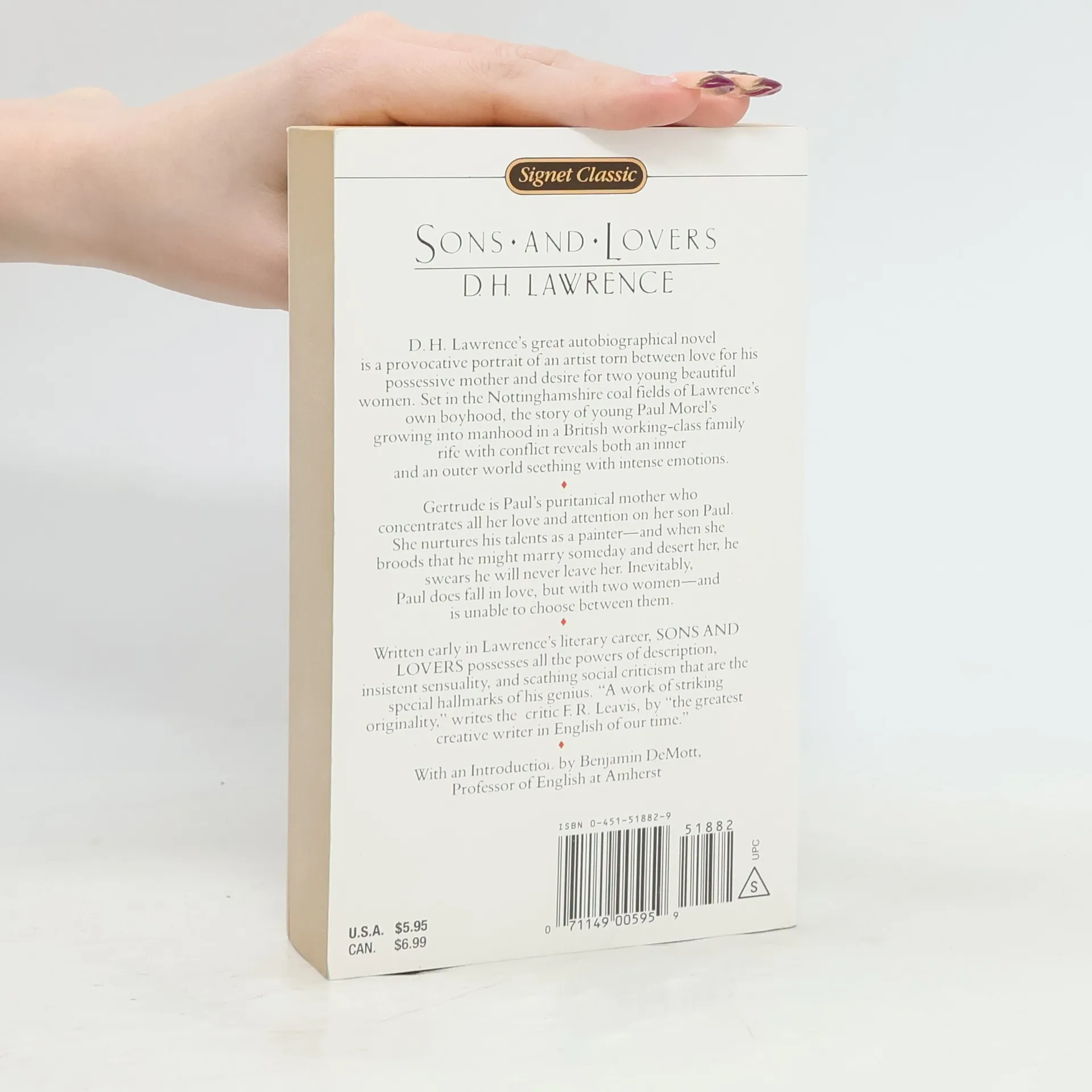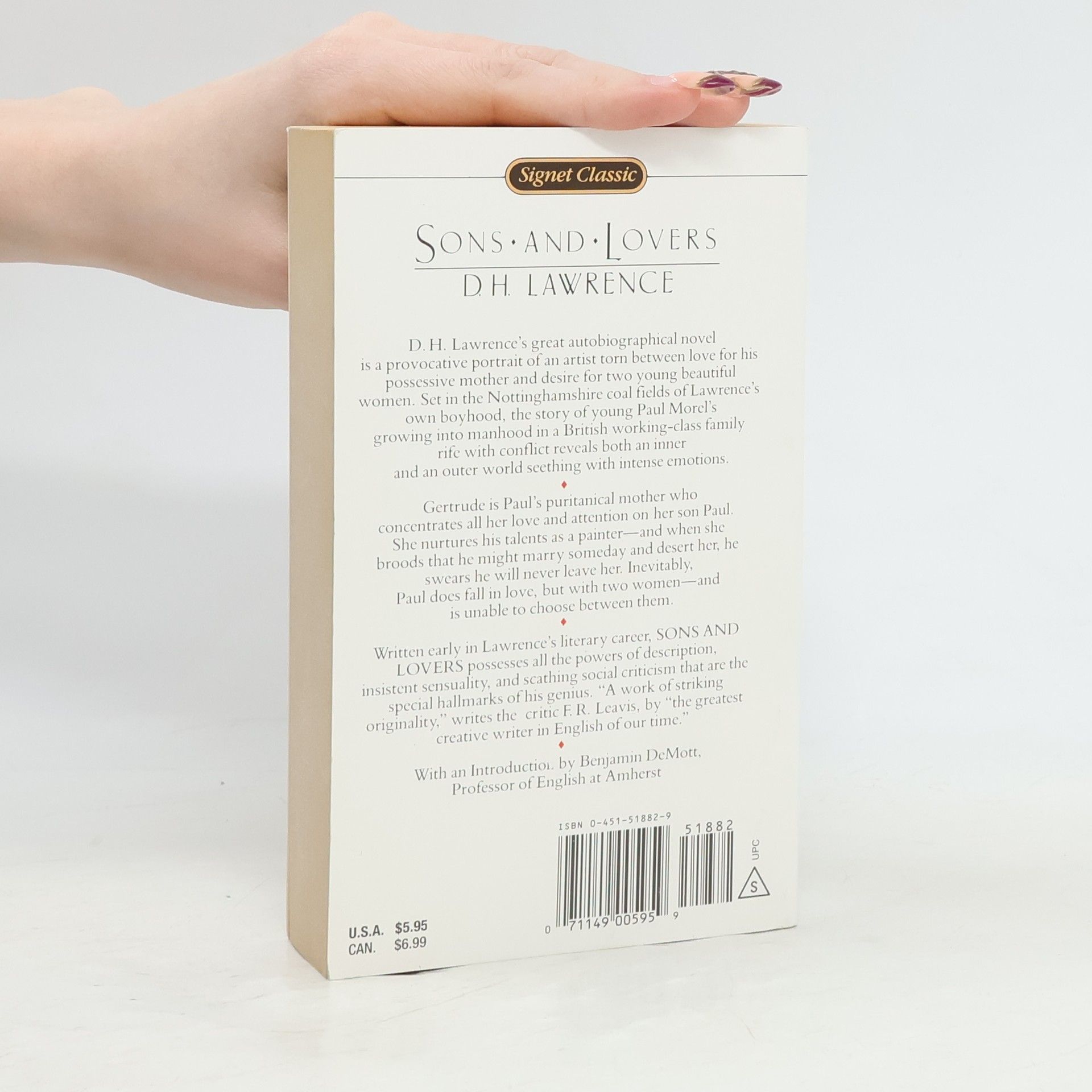 D.H. Lawrence's great autobiographical novel is a provocative portrait of an artist torn between love for his possessive mother and desire for two young beautiful women. Set in the Nottinghamshire coal fields of Lawrence's own boyhood, the story of young Paul Morel's growing into manhood in a British working-class family rife with conflict reveals both an inner and an outer world seething with intense emotions. Gertrude is Paul's puritanical mother who concentrates all her love and attention on her son Paul. She nurtures his talents as a painter - and when she broods that he might marry someday and desert her, he swears he will never leave her. Inevitably, Paul does fall in love, but with two women - and is unable to choose between them. Written early in Lawrence's literary career, Sons and Lovers possesses all the powers of description, insistent sensuality, and scathing social criticism that are the special hallmarks of his genius. "A work of striking originality," writes the critic F.R. Leavis, by "the greatest creative writer in English of our time." Book jacket.