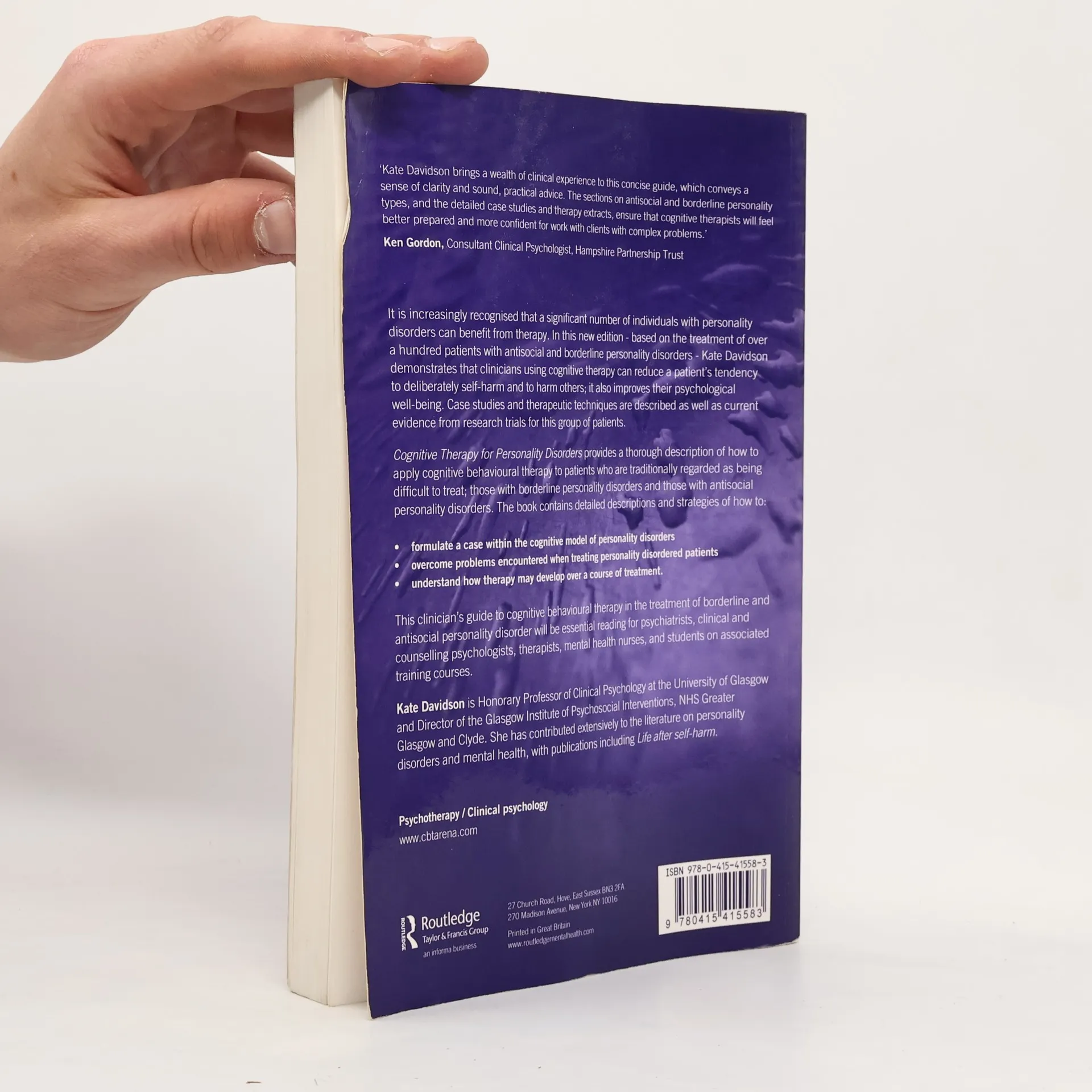 It is increasingly recognized that a significant number of individuals with personality disorders can benefit from therapy. In this new edition - based on the treatment of over a hundred patients with antisocial and borderline personality disorders - Kate Davidson demonstrates that clinicians using cognitive therapy can reduce a patient’s tendency to deliberately self-harm and to harm others; it also improves their psychological well-being. Case studies and therapeutic techniques are described as well as current evidence from research trials for this group of patients. Cognitive Therapy for Personality Disorders provides a thorough description of how to apply cognitive behavioural therapy to patients who are traditionally regarded as being difficult to those with borderline personality disorders and those with antisocial personality disorders. The book contains detailed descriptions and strategies of how This clinician’s guide to cognitive behavioural therapy in the treatment of borderline and antisocial personality disorder will be essential reading for psychiatrists, clinical and counselling psychologists, therapists, mental health nurses, and students on associated training courses.