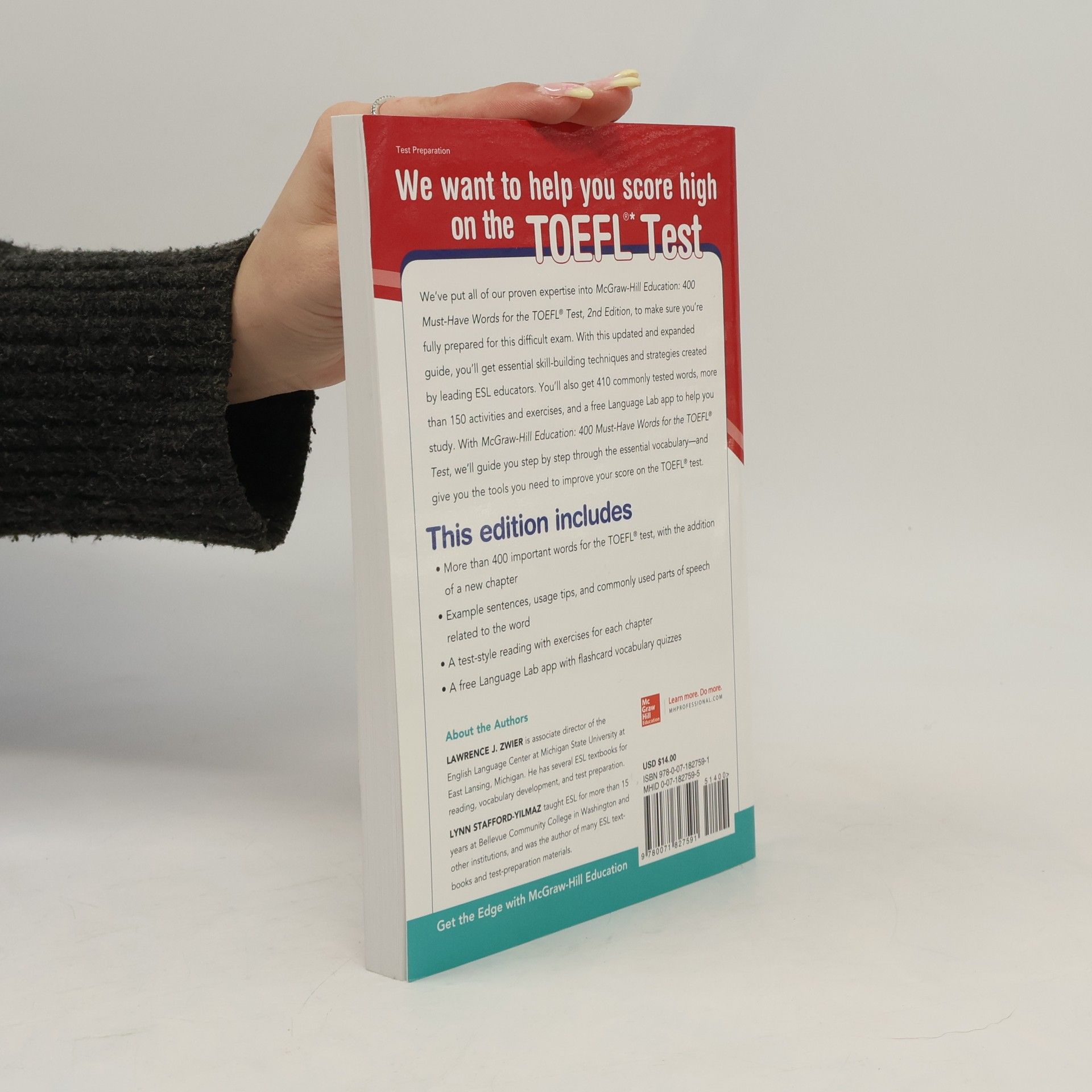 Publisher's Note: Products purchased from Third Party sellers are not guaranteed by the publisher for quality, authenticity, or access to any online entitlements included with the product. We want to help you score high on the TOEFL We've put all of our proven expertise into McGraw-Hill: 400 Must-Have Words for the TOEFL, 2nd Edition, to make sure you're fully prepared for this difficult exam. With this updated and expanded guide,you'll get essential skill-building techniques and strategies created by leading ESL educators. You'll also get 410 commonly tested words, more than 150 activities and exercises, and a free Language Lab app to help you study. With McGraw-Hill: 400 Must-Have Words for the TOEFL, we'll guide you step by step through the essential vocabulary--and give you the tools you need to improve your score on the TOEFL. This edition includes: More than 400 important words for the TOEFL, with the addition of a new chapter Example sentences, usage tips, and commonly used parts of speech related to the word A TOEFL-style reading with exercises for each chapter A free Language Lab app with flashcards to aid vocabulary memorization