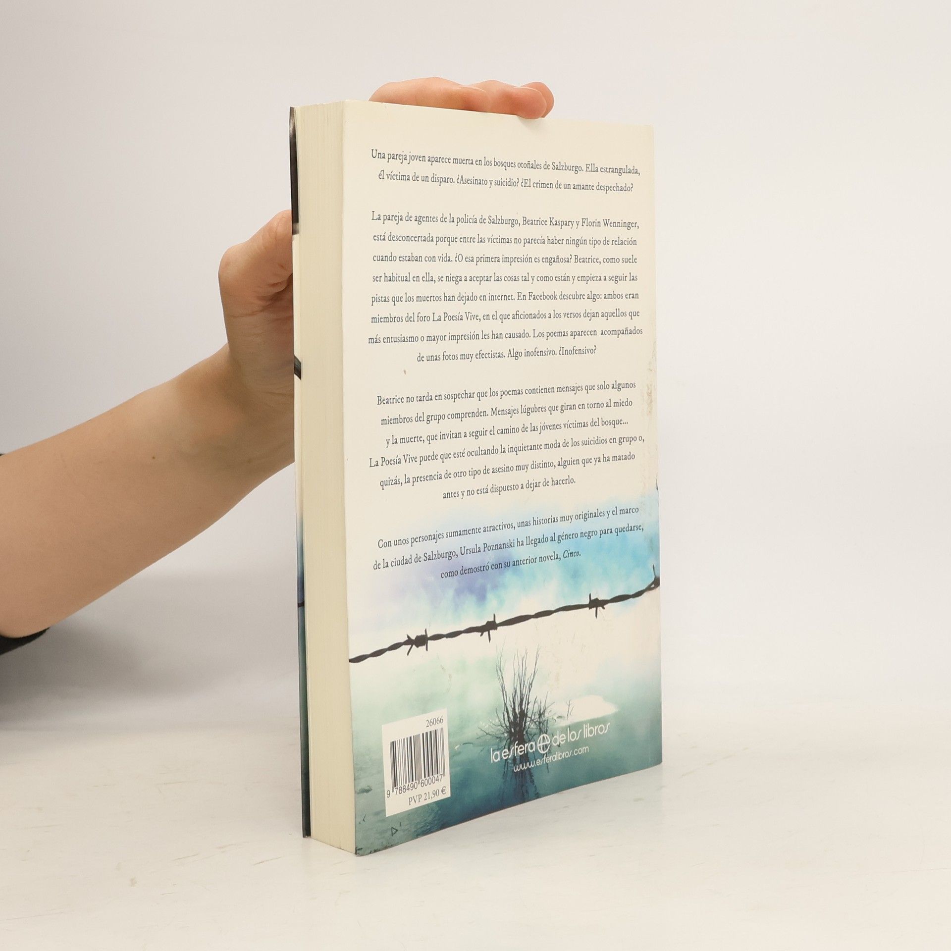Una pareja joven es hallada muerta en los bosques de Salzburgo: ella estrangulada y él con un disparo. La policía se enfrenta a un enigma: ¿asesinato y suicidio, o un crimen pasional? Beatrice Kaspary y Florin Wenninger, agentes de la Policía de Salzburgo, se sienten desconcertados, ya que no parece haber relación entre las víctimas. Sin embargo, Beatrice se niega a aceptar esta primera impresión y comienza a investigar en Internet. En Facebook, descubre que ambos eran miembros del foro La Poesía Vive, donde los aficionados comparten poemas que les impactan, acompañados de fotos llamativas. Aunque al principio parece inofensivo, Beatrice sospecha que los poemas contienen mensajes ocultos que solo algunos comprenden, relacionados con el miedo y la muerte. Estos mensajes podrían estar vinculados a una inquietante moda de suicidios conjuntos o a un asesino que ya ha matado antes y no planea detenerse. Con personajes cautivadores y tramas originales en el atractivo escenario de Salzburgo, la autora ha logrado una destacada incursión en el género negro.