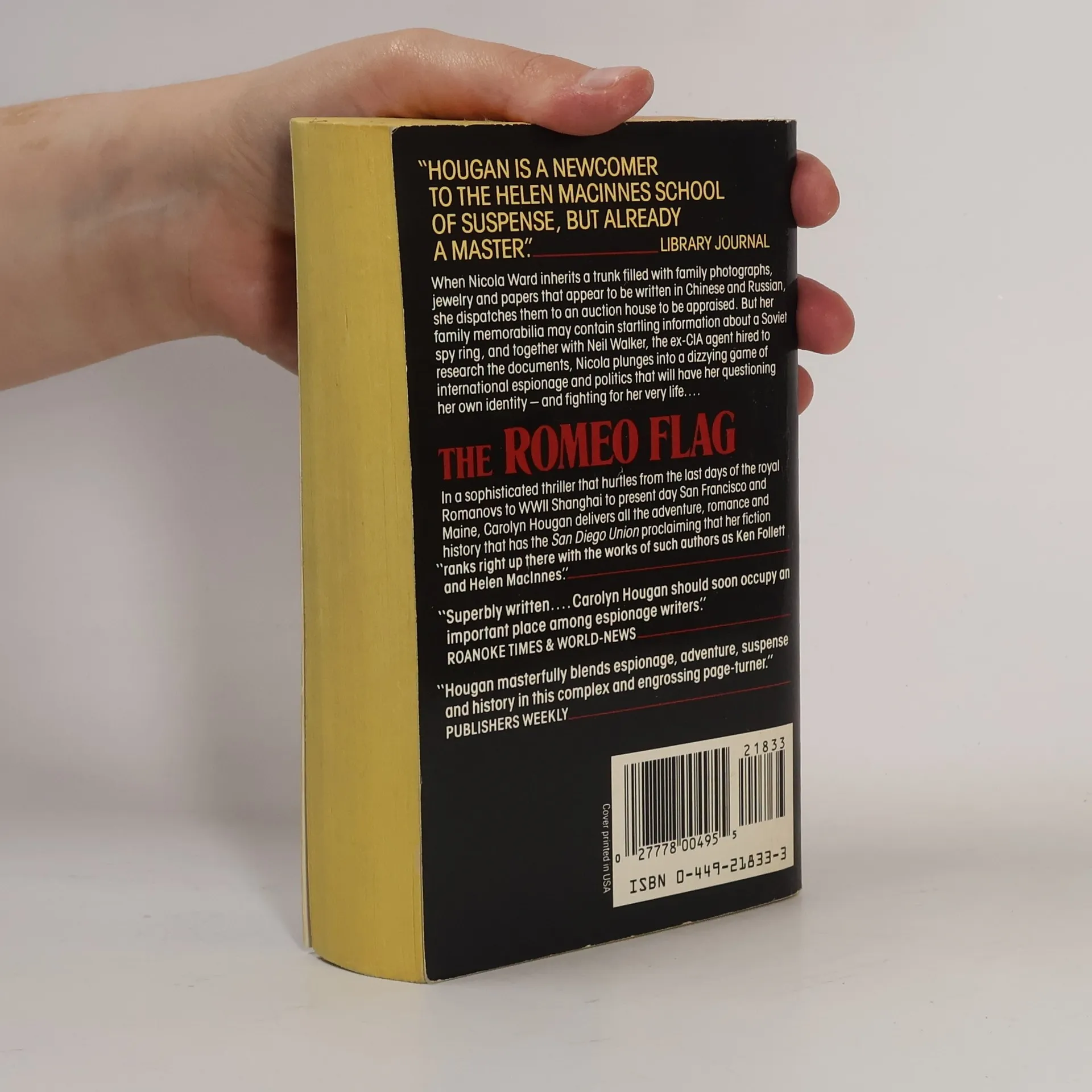 When Nicola Ward inherits a trunk filled with family photographs, jewelry and papers that appear to be written in Chinese and Russian, she dispatches them to an auction house to be appraised. But her family memorabilia may contain startling information about a Soviet spy ring, and together with Neil Walker, the ex-CIA agent hired to research the documents, Nicola plunges into a dizzying game of international espionage and politics that will have her questioning her own identity—and fighting for her very life.... In a sophisticated thriller that hurtles from the last days of the royal Romanovs to WWII Shanghai to present day San Francisco and Maine, Carolyn Hougan delivers all the adventure, romance and history that has the San Diego Union proclaiming that her fiction “ranks right up there with the works of such authors as Ken Follett and Helen MacInnes.”
