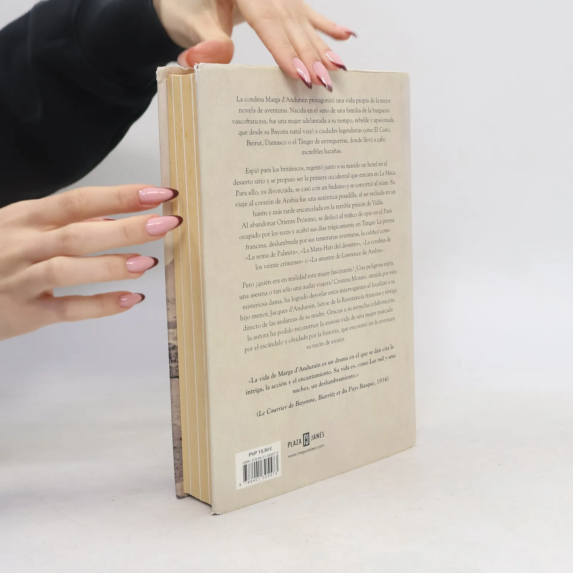 Marga dAndurain, nacida en Bayona en el seno de una familia de la burguesía vasca, tuvo una vida absolutamente novelesca. Vivió en Argentina, y tras la Primera Guerra Mundial se trasladó con su marido a El Cairo. Desde entonces espió para los británicos, regentó un hotel en Siria, se propuso ser la primera occidental que entrase en la Meca, fue encarcelada en un harén, traficó con opio en el París de la ocupación nazi y acabó sus días de la misma forma en que vivió, cuando se disponía a embarcar en su última gran aventura en el Tánger de finales de los años cuarenta