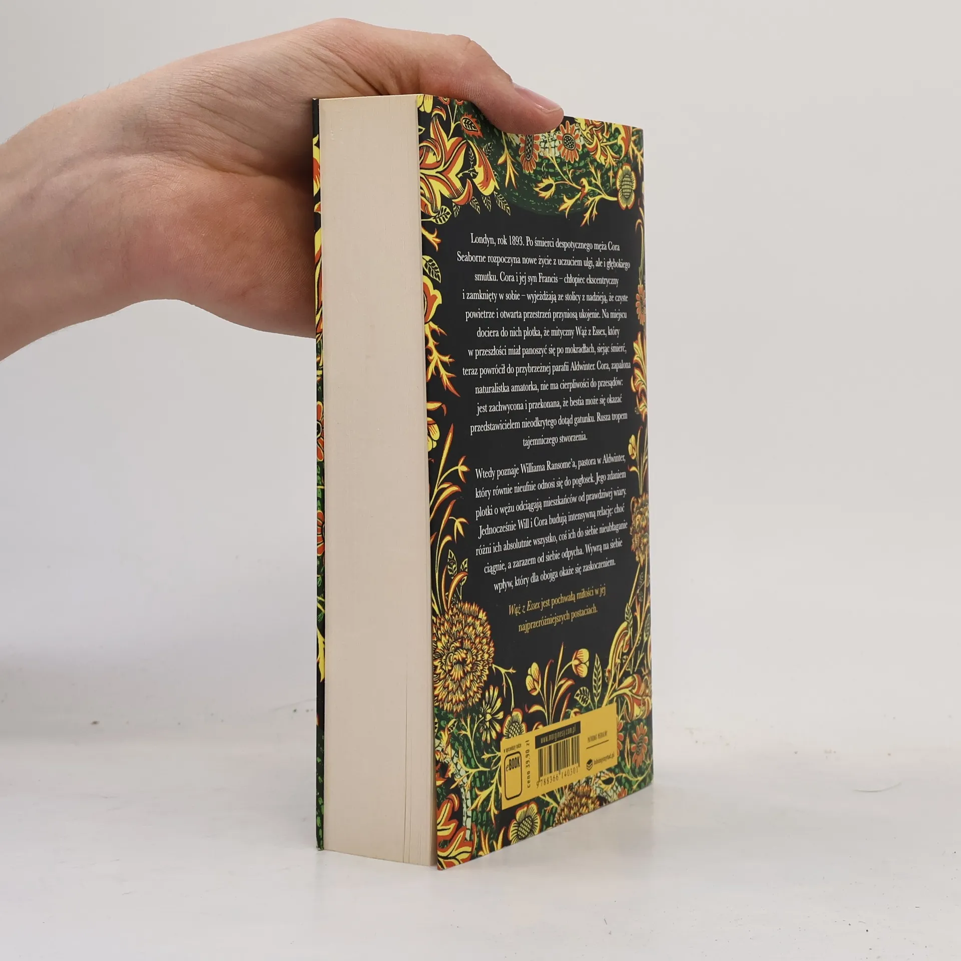 Londyn, rok 1893. Po śmierci despotycznego męża Cora Seaborne rozpoczyna nowe życie z uczuciem ulgi, ale i głębokiego smutku. Cora i jej syn Francis – chłopiec ekscentryczny i zamknięty sobie – wyjeżdżają ze stolicy do Essex z nadzieją, że czyste powietrze i otwarta przestrzeń przyniosą ukojenie. Na miejscu dociera do nich plotka, że mityczny Wąż z Essex, który w przeszłości miał ponoć panoszyć się po mokradłach, siejąc śmierć, teraz powrócił do przybrzeżnej parafii Aldwinter. Cora, zapalona naturalistka-amatorka, nie ma cierpliwości do przesądów: jest zachwycona, i przekonana, że bestia może się okazać przedstawicielem nieodkrytego dotąd gatunku. Rusza tropem tajemniczego stworzenia. Wtedy poznaje Williama Ransome’a, pastora w Aldwinter, który również nieufnie odnosi się do pogłosek. Jego zdaniem jednak plotki o wężu tylko odciągają mieszkańców od prawdziwej wiary. Pastor stara się uspokoić parafian. Jednocześnie Will i Cora budują intensywną relację: choć różni ich absolutnie wszystko, coś ich do siebie nawzajem nieubłaganie ciągnie, a zarazem od siebie odpycha. Wywrą na siebie wpływ, który dla obojga okaże się zaskoczeniem. <i>Wąż z Essex</i> jest pochwałą miłości w jej najprzeróżniejszych postaciach.