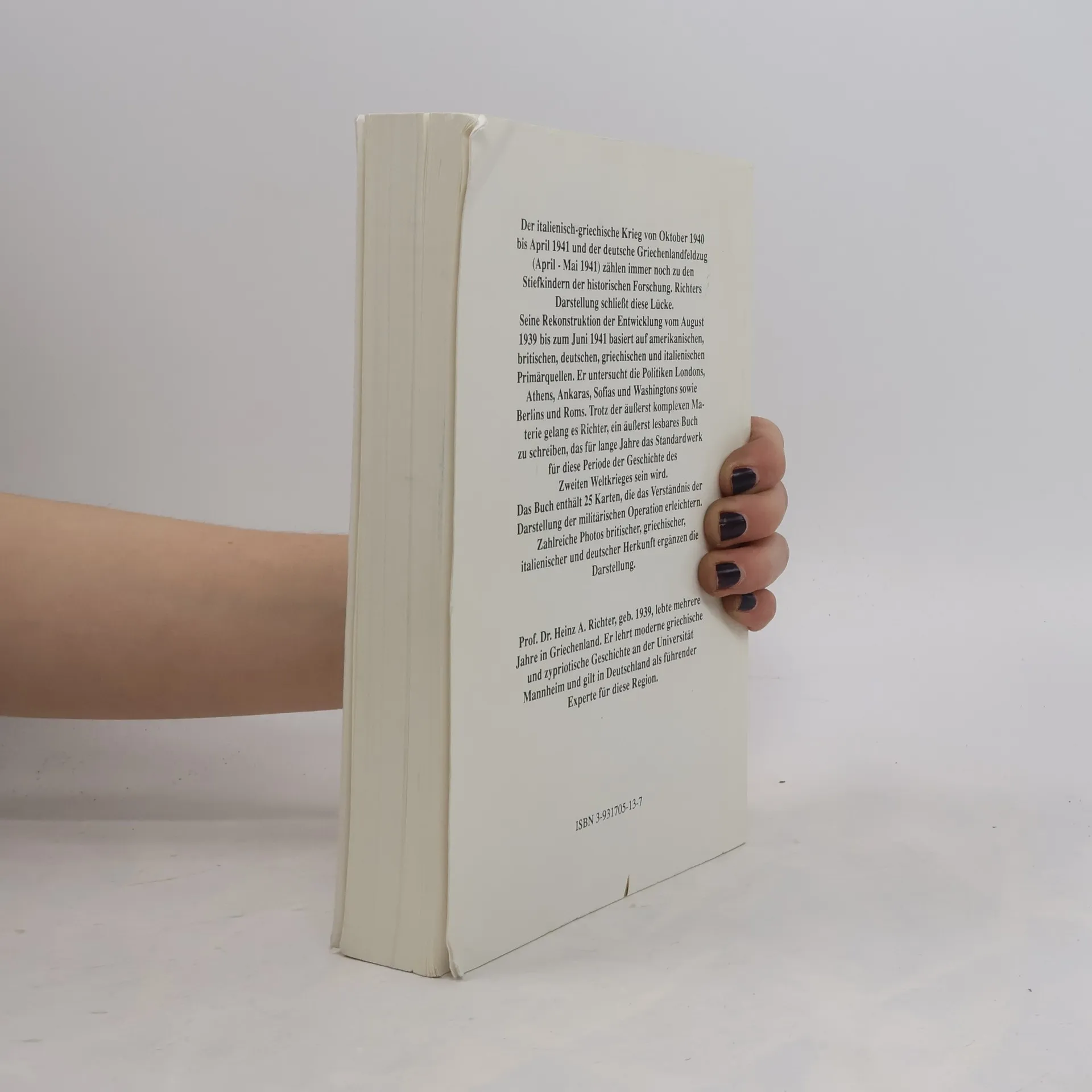 Von den Feldzügen des Zweiten Weltkriegs gehören der italienisch-griechische Krieg von Oktober 1940 bis April 1941 und der deutsche Griechenlandfeldzug (April bis Mai 1941) immer noch zu den Stiefkindern der historischen Forschung. In Italien hat man diesen Krieg verdrängt, und eine wissenschaftliche Aufarbeitung gibt es bis heute nicht. Auch in Deutschland hat sich die Forschung kaum mit diesem Thema beschäftigt; der Balkanfeldzug wurde als kurze Episode vor dem Russlandfeldzug betrachtet. In Großbritannien ist eine größere Zahl von Darstellungen erschienen, die alle einen stark apologetischen Charakter haben, da sie die britische Entscheidung, den Griechen zu Hilfe zu kommen, rechtfertigen; obwohl diese Hilfe – wie auch ein Jahr zuvor in Norwegen – zu einem militärischen Fiasko führte und den siegreichen britischen Vorstoß in Nordafrika erheblich behinderte. Heinz A. Richters Studie zu Griechenland im Zweiten Weltkrieg zeigt die Zusammenhänge zwischen der britischen Entscheidung, Griechenland militärisch zu unterstützen, und der amerikanischen Lend-lease-Gesetzgebung auf. An seine Darstellung anschließend widerlegt Richter die von allen Beteiligten gleichermaßen beanspruchte Geschichtslegende, wonach der Griechenlandfeldzug Hitler den Sieg vor Moskau gekostet und damit letztlich zu seiner Niederlage geführt habe. Im Oktober 2010 jährten sich der italienische Angriff auf Griechenland und im April 2011 der deutsche, die Operation Marita, zum 70ten Mal. Die Studie erscheint zu diesem Anlass in zweiter, überarbeiteter Auflage.