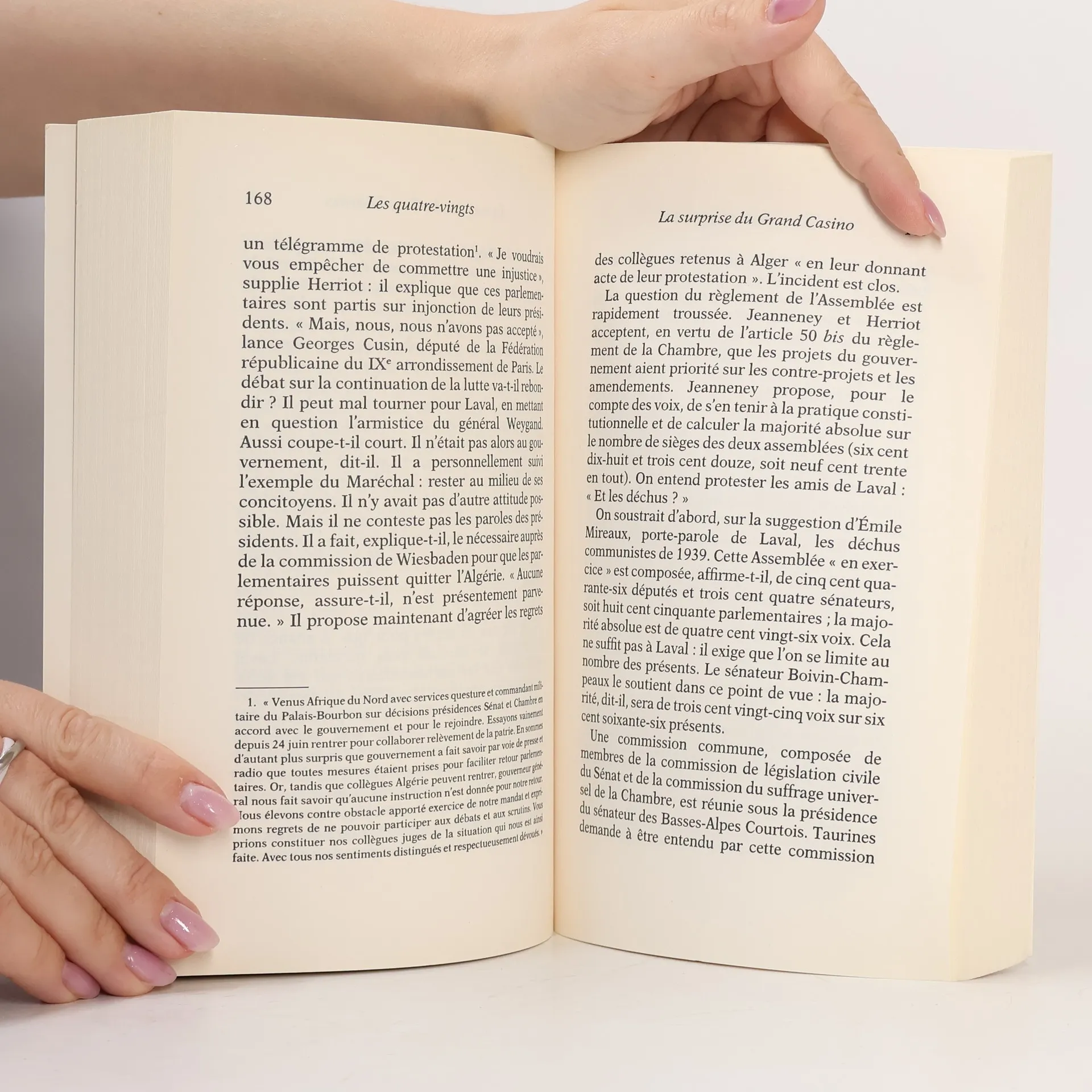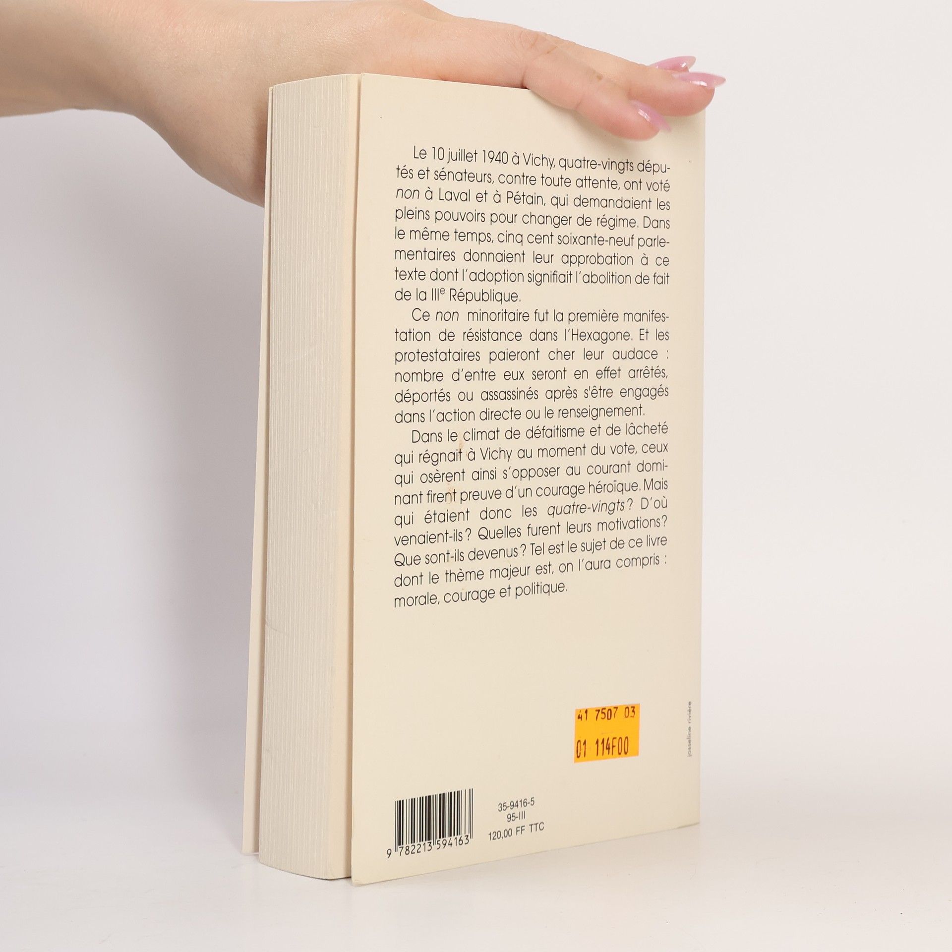 Le 10 juillet 1940 à Vichy, quatre-vingts députés et sénateurs, contre toute attente, ont voté non à Laval et à Pétain, qui demandaient les pleins pouvoirs pour changer de régime. Dans le même temps, cinq cent soixante-neuf parlementaires donnaient leur approbation à ce texte dont l'adoption signifiait l'abolition de fait de la III e République.Ce non minoritaire fut la première manifestation de résistance dans l'Hexagone. Et les protestataires paieront cher leur nombre d'entre eux seront en effet arrêtés, déportés ou assassinés après s'être engagés dans l'action directe ou le renseignement.Dans le climat de défaitisme et de lâcheté qui régnait à Vichy au moment du vote, ceux qui osèrent ainsi s'opposer au courant dominant firent preuve d'un courage héroïque. Mais qui étaient donc les quatre-vingts ? D'où venaient-ils? Quelles furent leurs motivations? Que sont-ils devenus? Tel est le sujet de ce livre dont le thème majeur est, on l'aura morale, courage et politique.