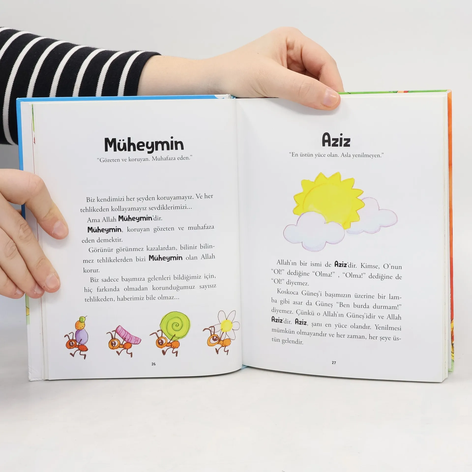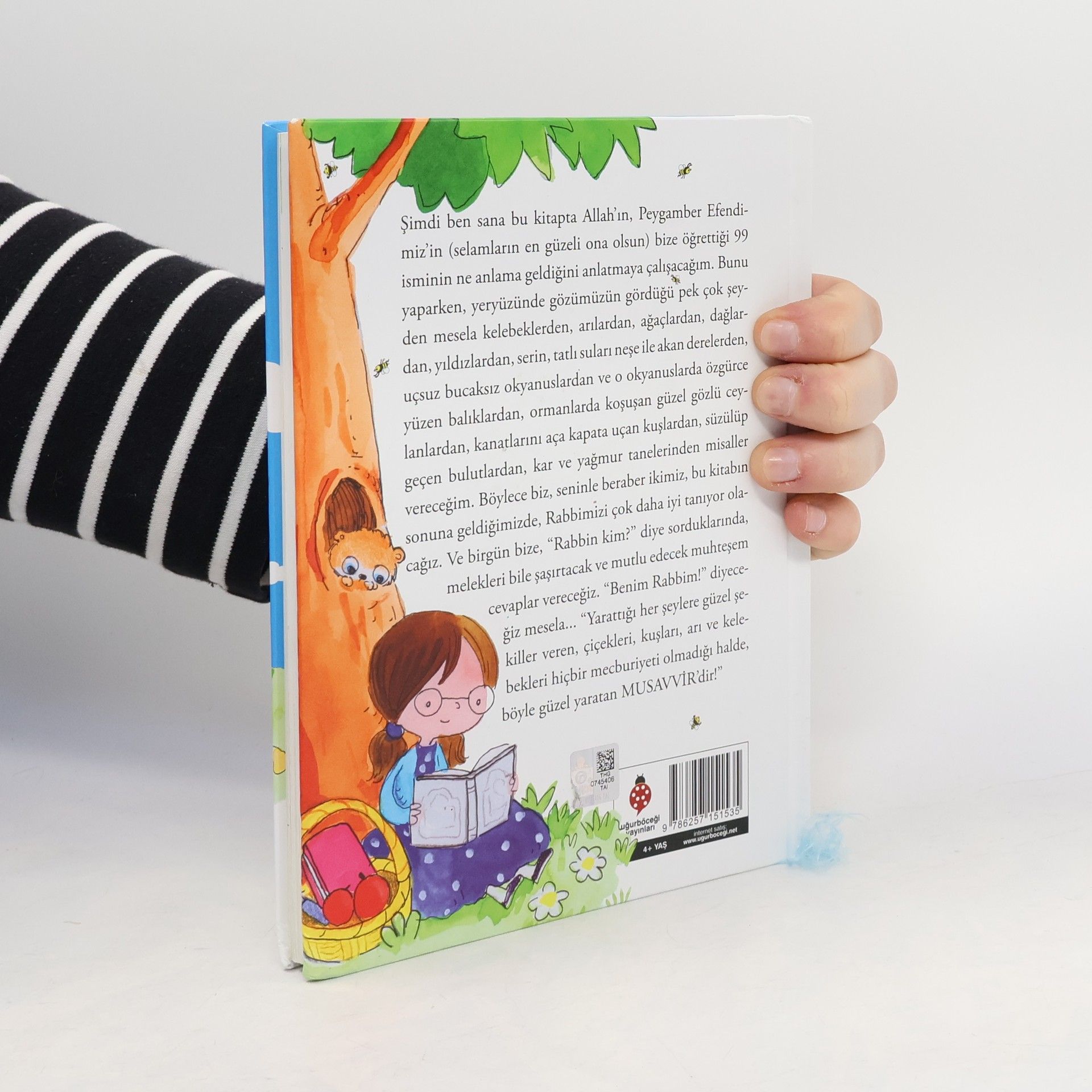 Original bdg. 16,50 / 22,00 cm. in Turkish. 144 p. Resimleyen / Çizen / Fotograf : Sevgi Içigen Simdi ben sana bu kitapta Allah'in, Peygamber Efendimiz'in (selamlarin en güzeli ona olsun) bize ögrettigi 99 isminin ne anlama geldigini anlatmaya çalisacagim. Bunu yaparken, yeryüzünde gözümüzün gördügü pek çok seyden mesela kelebeklerden, arilardan, agaçlardan, daglardan, yildizlardan, serin, tatli sulari nese ile akan derelerden, uçsuz bucaksiz okyanuslardan ve o okyanuslarda özgürce yüzen baliklardan, ormanlarda kosusan güzel gözlü ceylanlardan, kanatlarini aça kapata uçan kuslardan, süzülüp geçen bulutlardan, kar ve yagmur tanelerinden misaller verecegim. Böylece biz, seninle beraber ikimiz, bu kitabin sonuna geldigimizde, Rabbimizi çok daha iyi taniyor olacagiz. Ve birgün bize, "Rabbin kim?" diye sorduklarinda, melekleri bile sasirtacak ve mutlu edecek muhtesem cevaplar verecegiz. "Benim Rabbim!" diyecegiz mesela... "Yarattigi her seylere güzel sekiller veren, çiçekleri, kuslari, ari ve kelebekleri hiçbir mecburiyeti olmadigi halde, böyle güzel yaratan Musavvir'dir!"