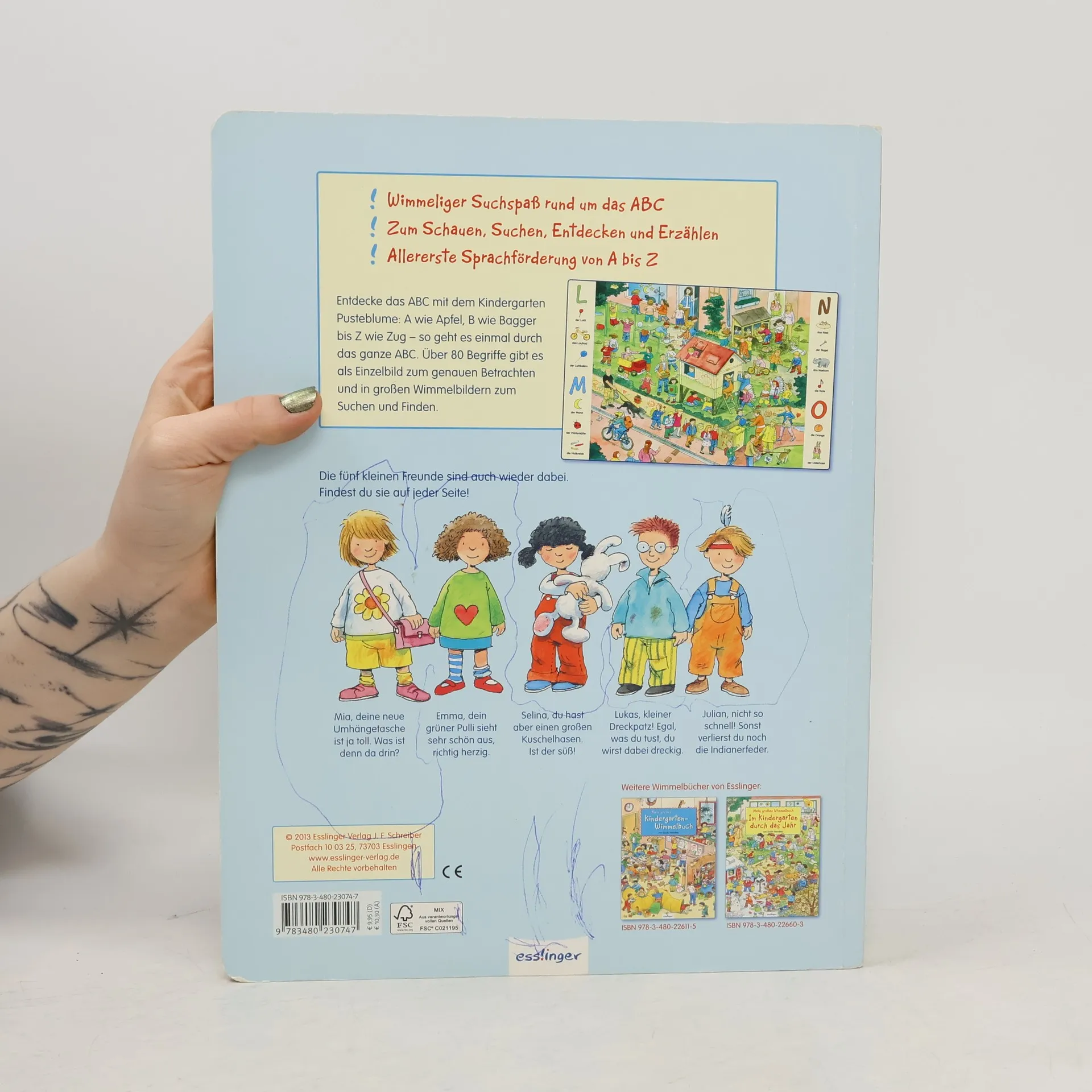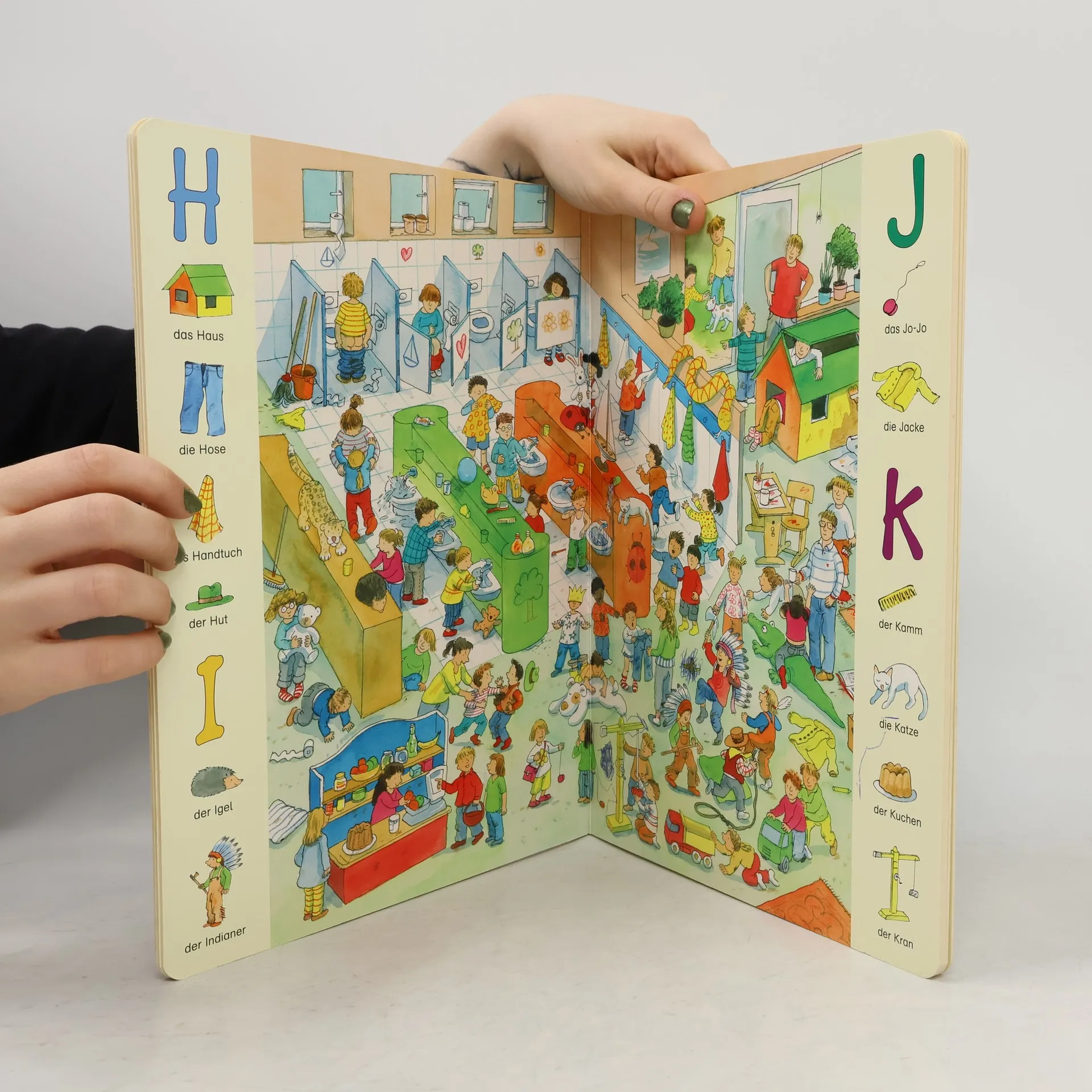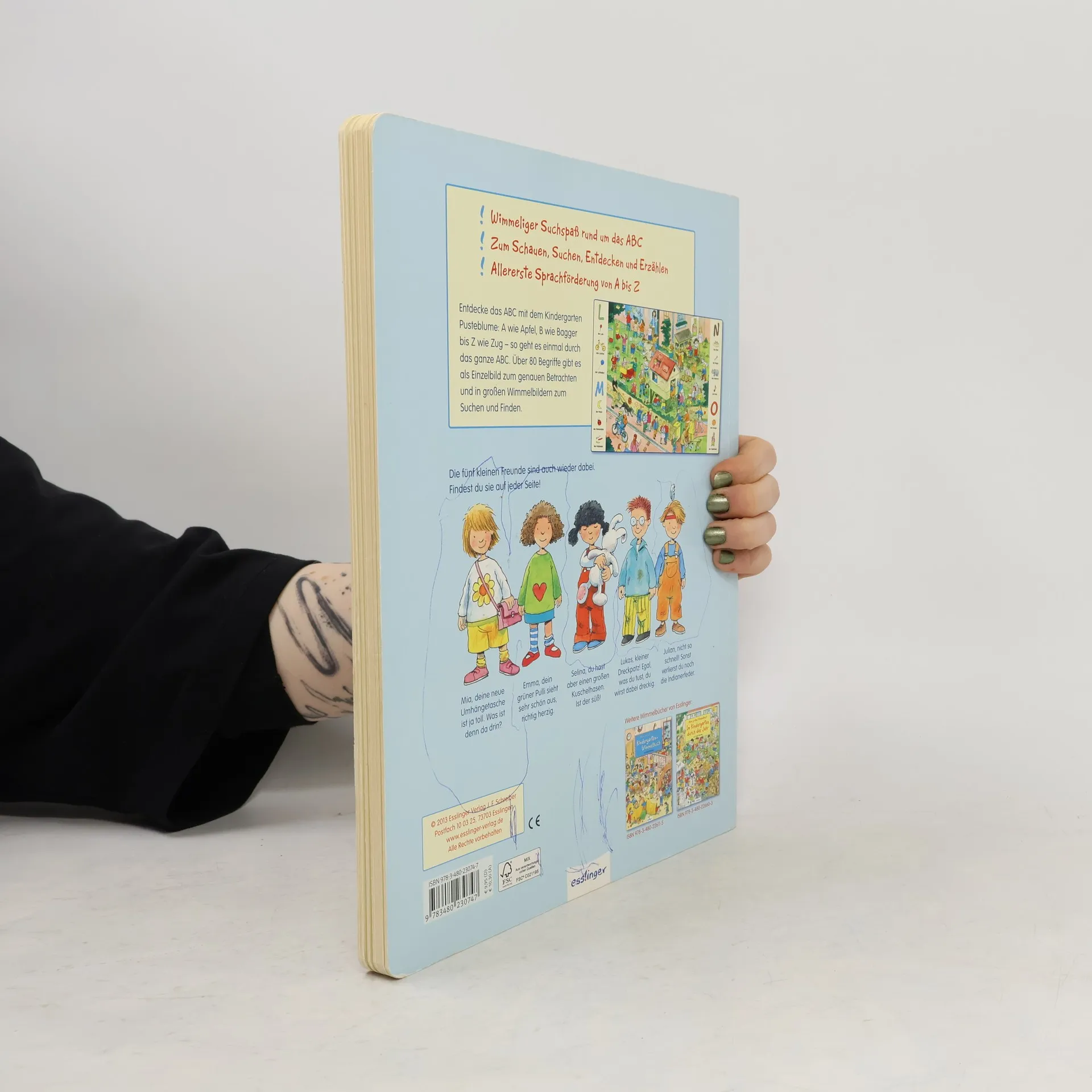 Wimmelige, textlose Szenen, die im Kindergarten und auf einem Ausflug spielen, werden umrahmt von Einzelbildern von A-Z, die im grossen Bild gesucht werden können.