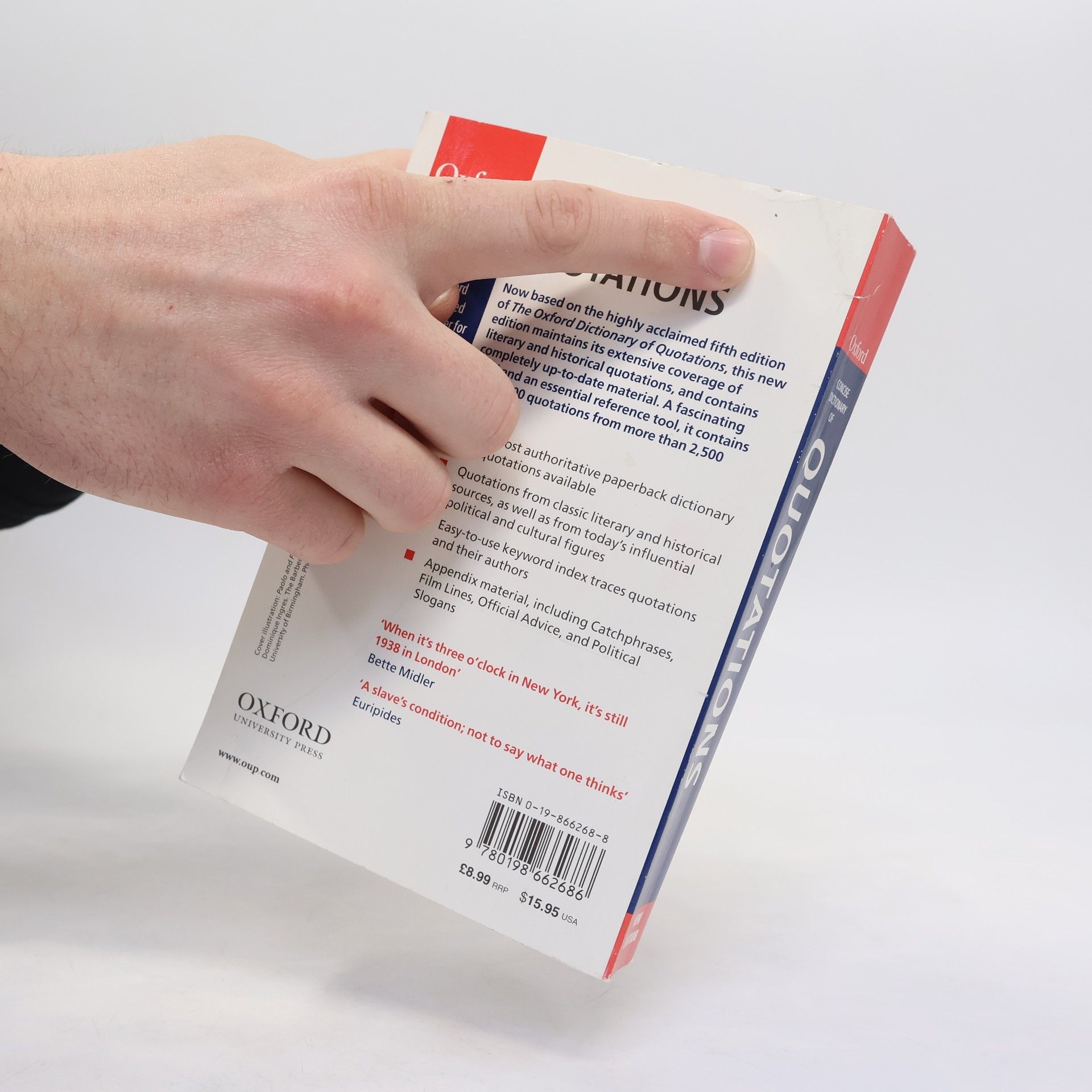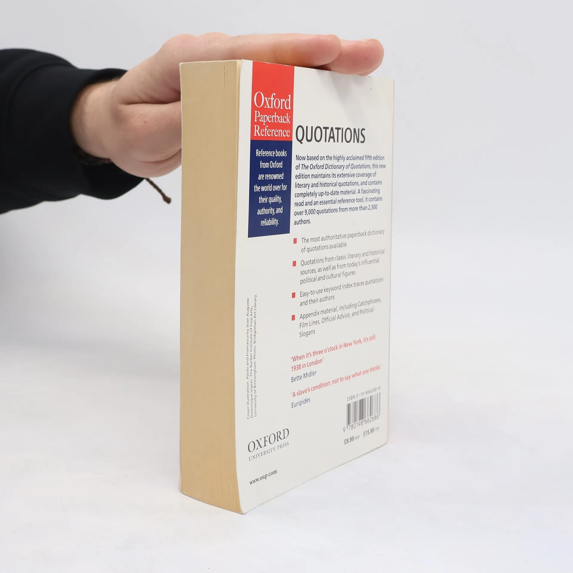 In this revised and expanded edition of The Concise Oxford Dictionary of Quotations, you can find (and verify) classic quotes and little known gems - the words of the famous and the notorious, the witty and the wise - in a collection of over 9,000 quotations from more than 2,000 authors. Offering all the authority and accuracy of the acclaimed Oxford Dictionary of Quotations, the Concise now includes recent quotes of the 1990s, as well as new appendices on Sayings of the Nineties, Slogans, and Popular Misquotations. Perhaps the most useful feature of this dictionary is a key-word index, for tracing half-remembered quotations to their authors, or finding quotations on a particular subject.