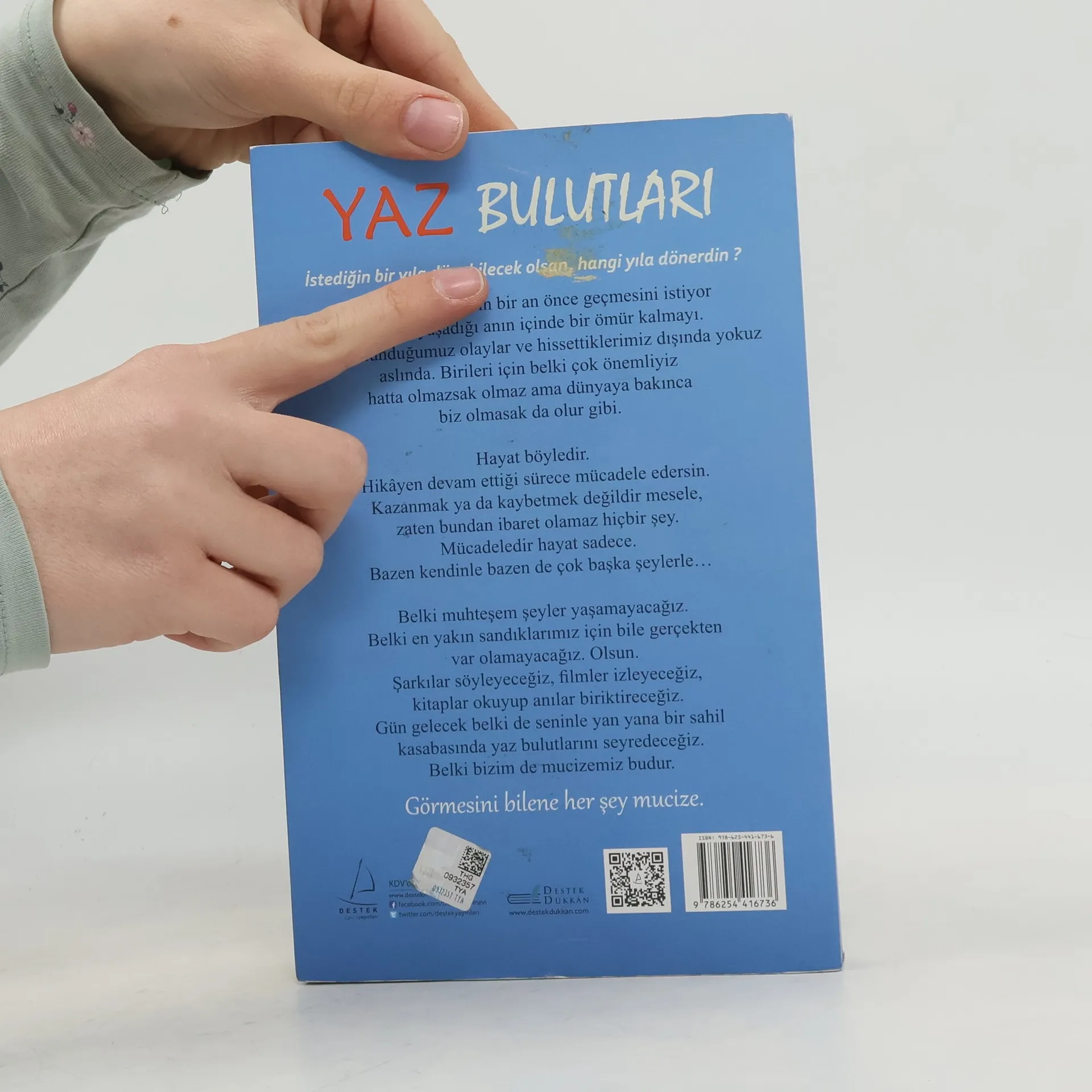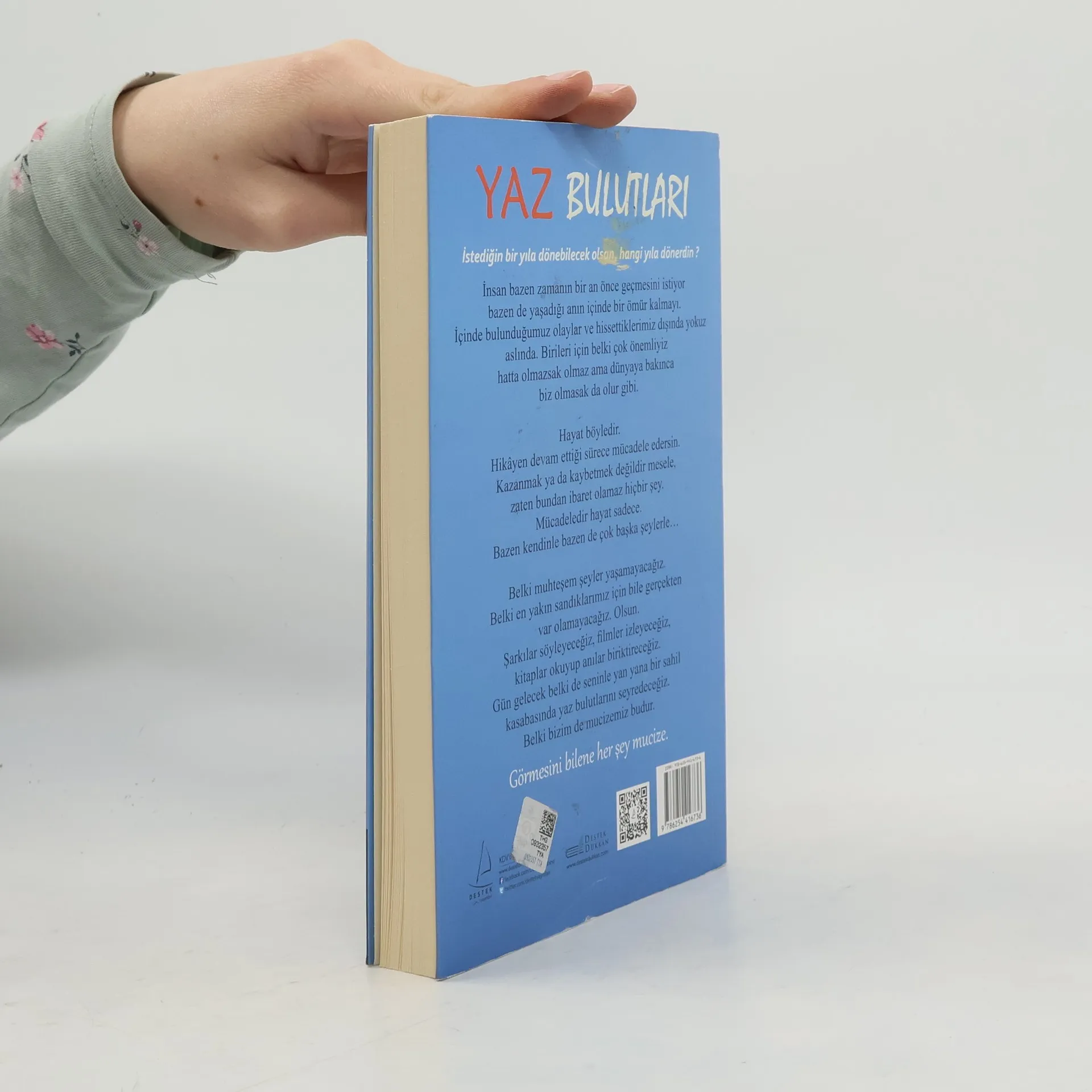 İstediğin bir yıla dönebilecek olsan, hangi yıla dönerdin?İnsan bazen zamanın bir an önce geçmesini istiyor bazen de yaşadığı anın içinde bir ömür kalmayı. İçinde bulunduğumuz olaylar ve hissettiklerimiz dışında yokuz aslında. Birileri için belki çok önemliyiz hatta olmazsak olmaz ama dünyaya bakınca biz olmasak da olur gibi.Hayat böyledir. Hikâyen devam ettiği sürece mücadele edersin. Kazanmak ya da kaybetmek değildir mesele, zaten bundan ibaret olamaz hiçbir şey. Mücadeledir hayat sadece. Bazen kendinle bazen de çok başka şeylerle…Belki muhteşem şeyler yaşamayacağız. Belki en yakın sandıklarımız için bile gerçekten var olamayacağız. Olsun. Şarkılar söyleyeceğiz, filmler izleyeceğiz, kitaplar okuyup anılar biriktireceğiz. Gün gelecek belki de seninle yan yana bir sahil kasabasında yaz bulutlarını seyredeceğiz. Belki bizim de mucizemiz budur.Görmesini bilene her şey mucize.