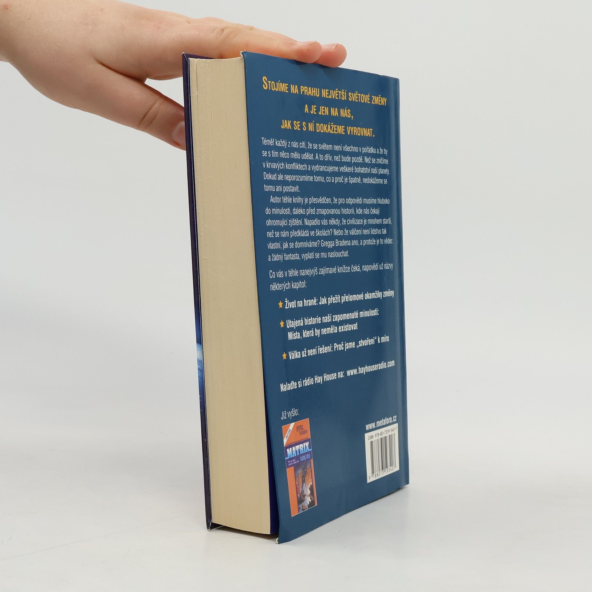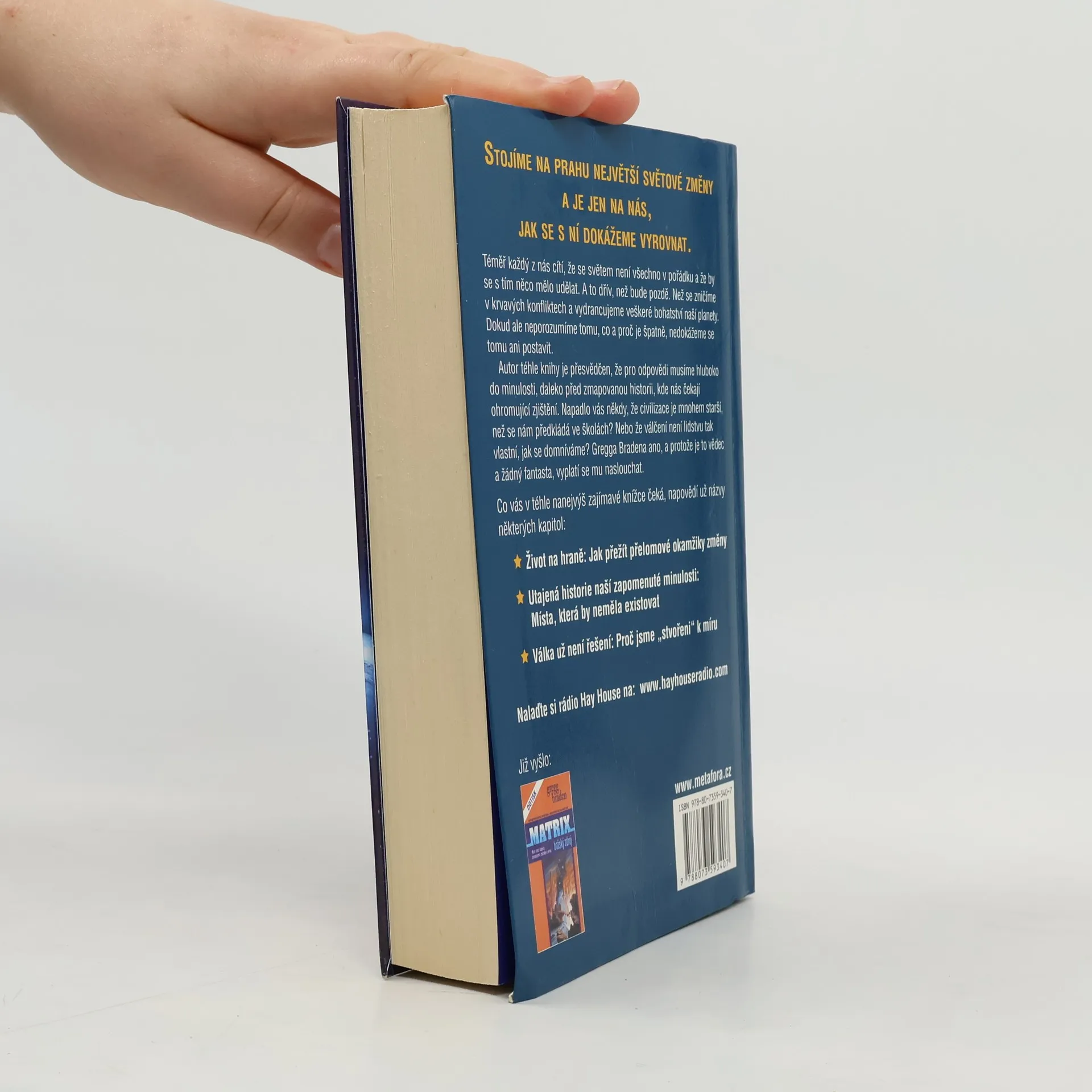 Téměř každý z nás cítí, že se světem není všechno v pořádku a že by se s tím něco mělo udělat. A to dřív, než se zničíme v krvavých konfliktech a vydrancujeme veškeré bohatství naší planety. Dokud ale neporozumíme tomu, co a proč je špatně, nedokážeme se tomu ani postavit. Pro odpovědi musíme ovšem hluboko do minulosti, daleko před zmapovanou historii, kde nás čekají ohromující zjištění. Napadlo vás někdy, že civilizace je mnohem starší, než se nám předkládá ve školách? Nebo že válčení není lidstvu tak vlastní, jak se domníváme? Gregga Bradena ano, a protože je to vědec a žádný fantasta, vyplatí se mu naslouchat. Zdá se, že historie se v obrovských cyklech opakuje a že právě teď se ke konci jednoho takového "světového věku" rychle blížíme.