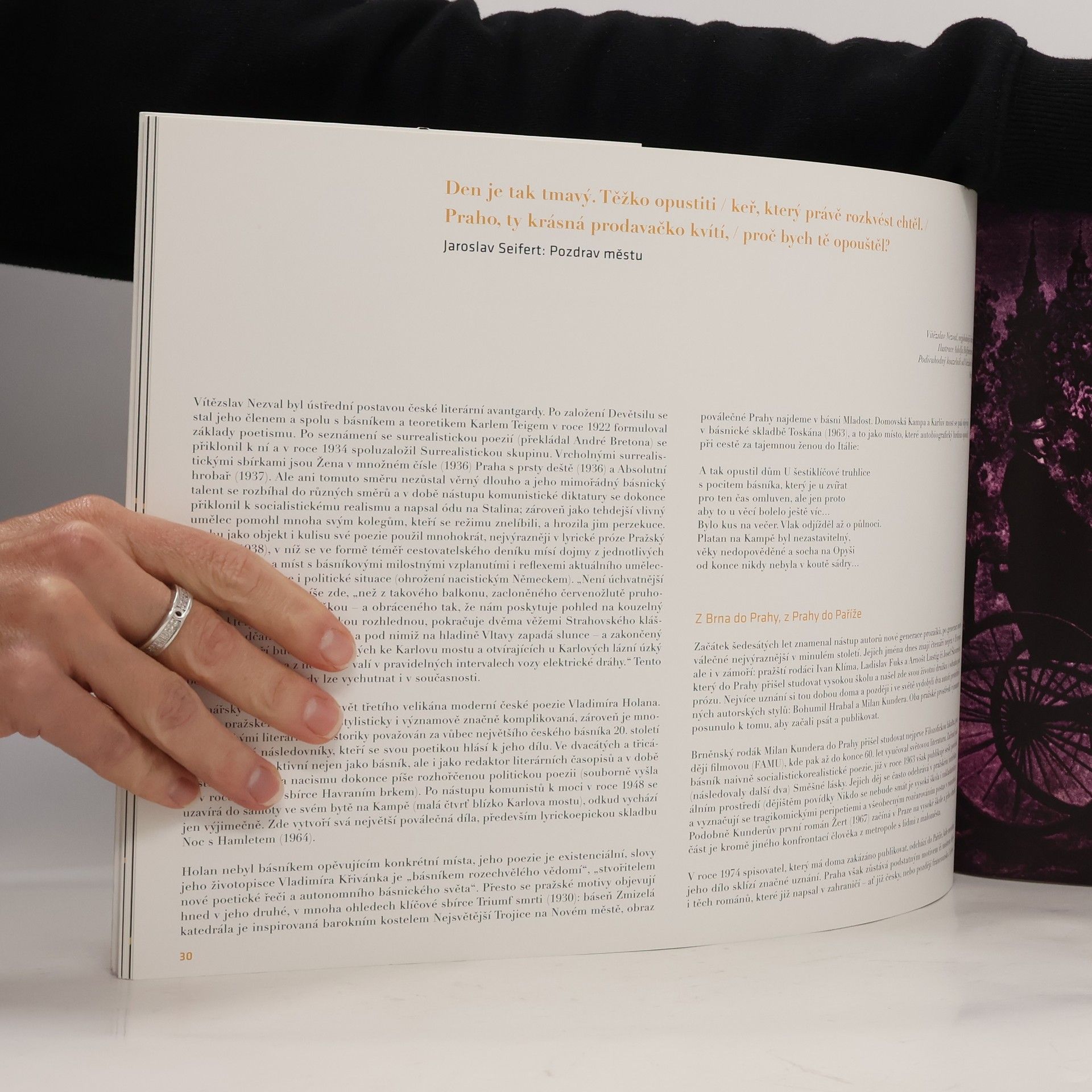 Kniha přináší pohled na bohatou literární historii hlavního města Prahy a dává nahlédnout do neméně bohaté literární současnosti. V textech se potkají významní autoři, citují díla s Prahou související a popisují události, které měly na pražský literární život vliv. Obrazový doprovod tvoří vybrané ilustrace z knih, které se k Praze Váží svým obsahem nebo jsou jejich autoři s Prahou neodmyslitelně spjati. Celkový pohled na vývoj pražské literatury v historických souvislostech přináší chronologický přehled.