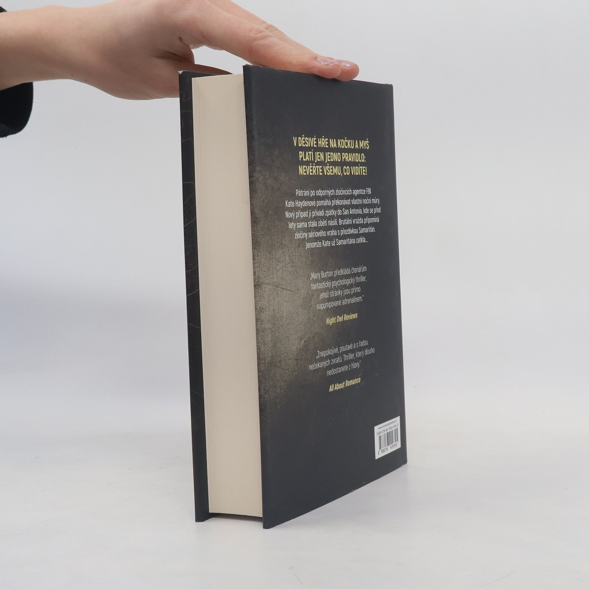 V samostatném detektivním románu slavné autorky Mary Burtonové musí agentka FBI dopadnout vraha, který napodobuje zločiny, na jejichž vyšetřování se v minulosti podílela. Tentokrát se ale má poslední obětí stát ona sama. Pátrání po odporných zločincích agentce FBI Kate Haydenové pomáhá překonávat vlastní noční můry. Nový případ ji přivádí zpátky do San Antonia, kde se před lety sama stala obětí násilí. Brutální vražda připomíná zločiny sériového vraha s přezdívkou Samaritán. Jenomže Kate už Samaritána zatkla. Buď se tedy dopustila osudového omylu, nebo jeho práci někdo napodobuje. Za přispění detektiva Thea Mazura z oddělení vražd si Kate brzy uvědomí, že tento případ je ještě zamotanější, než zpočátku vypadal. Netrvá dlouho a ve městě se objeví další mrtvá žena. I ona zemřela způsobem, který se shoduje s jiným uzavřeným případem. Doktorka Haydenová a detektiv Mazur se pouštějí do boje se lstivým nepřítelem, který Kate dokonale zná. Čím blíže se k němu dostávají, tím více si uvědomují, že v této děsivé hře platí jediné pravidlo: nevěř všemu, co vidíš…