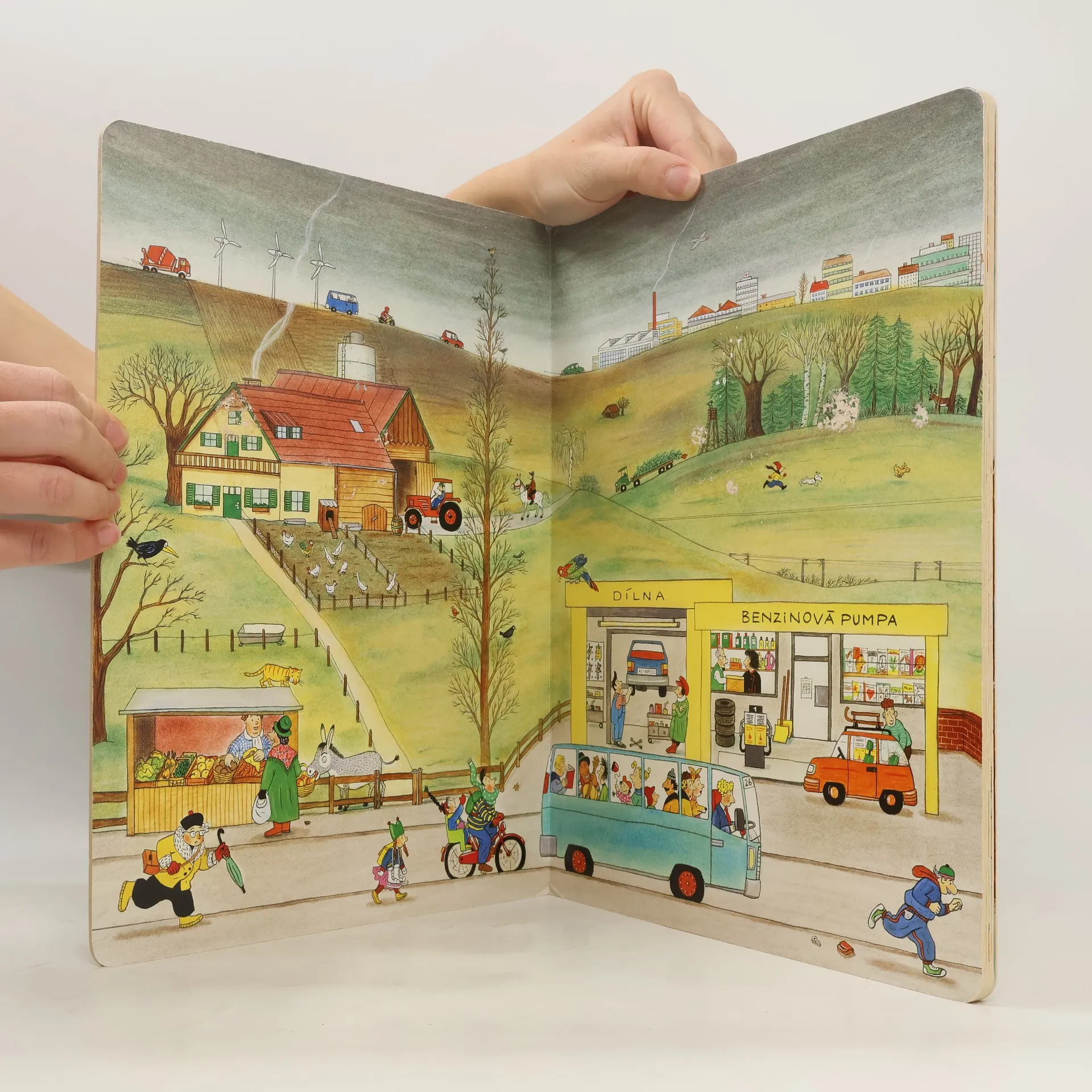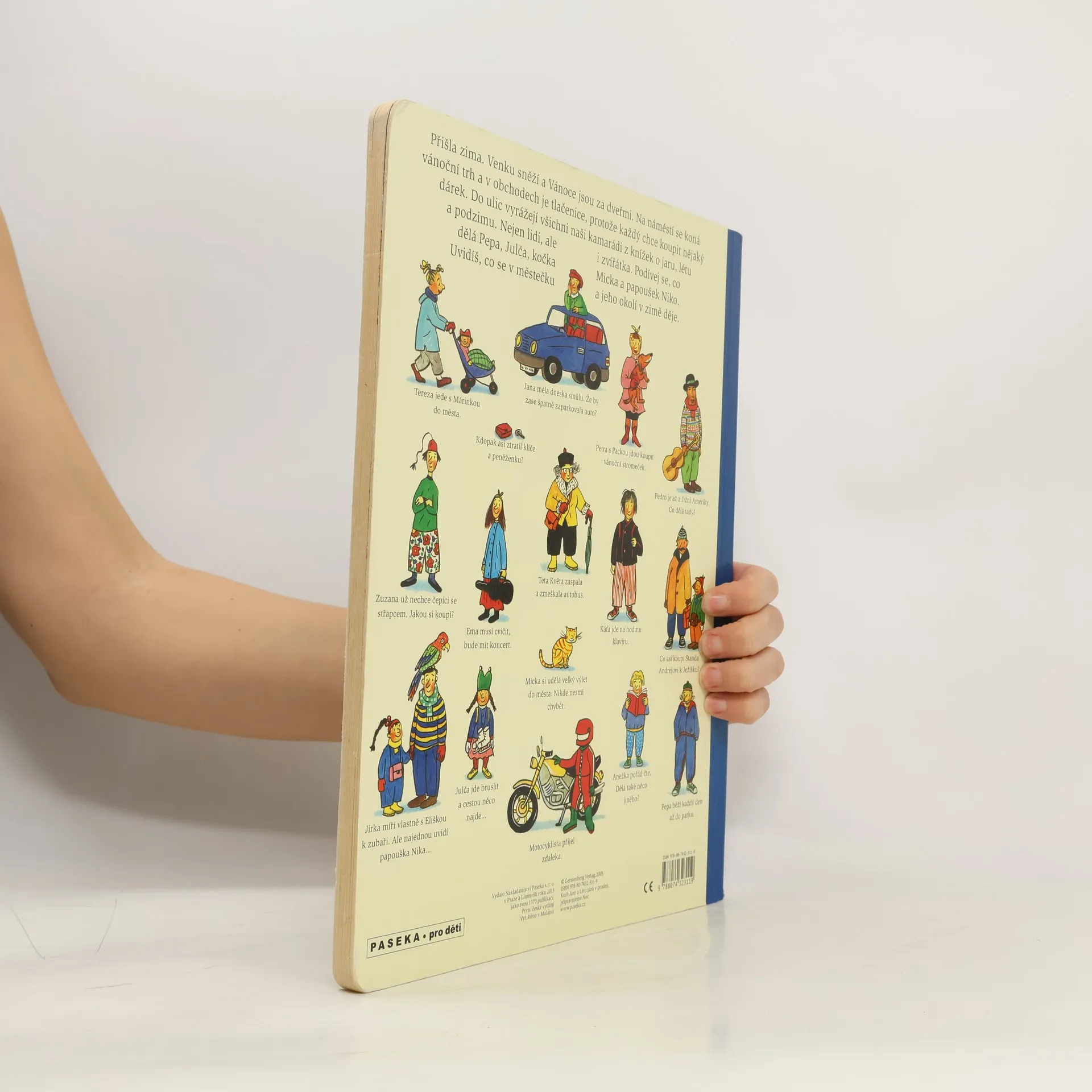 Po knížce o jaru, létu a podzimu přichází Zima. Rotraut Suzanne Bernerová na obrázcích znovu vypráví své malé, vtipné příběhy všedního dne, které poutají a bystří pozornost, podněcují fantazii a řečové schopnosti, ale hlavně baví malé i větší děti. V předvánoční atmosféře se opět setkáte s některými starými známými a kamarády z předchozích tří úspěšných knížek. Přibudou další postavy, věci a zvířátka. Jen místo zůstává stejné: město s ulicemi, domy, s tržištěm, obchody, k tomu park a nedaleký statek. Podívejte se, co všechno se v Zimě děje!