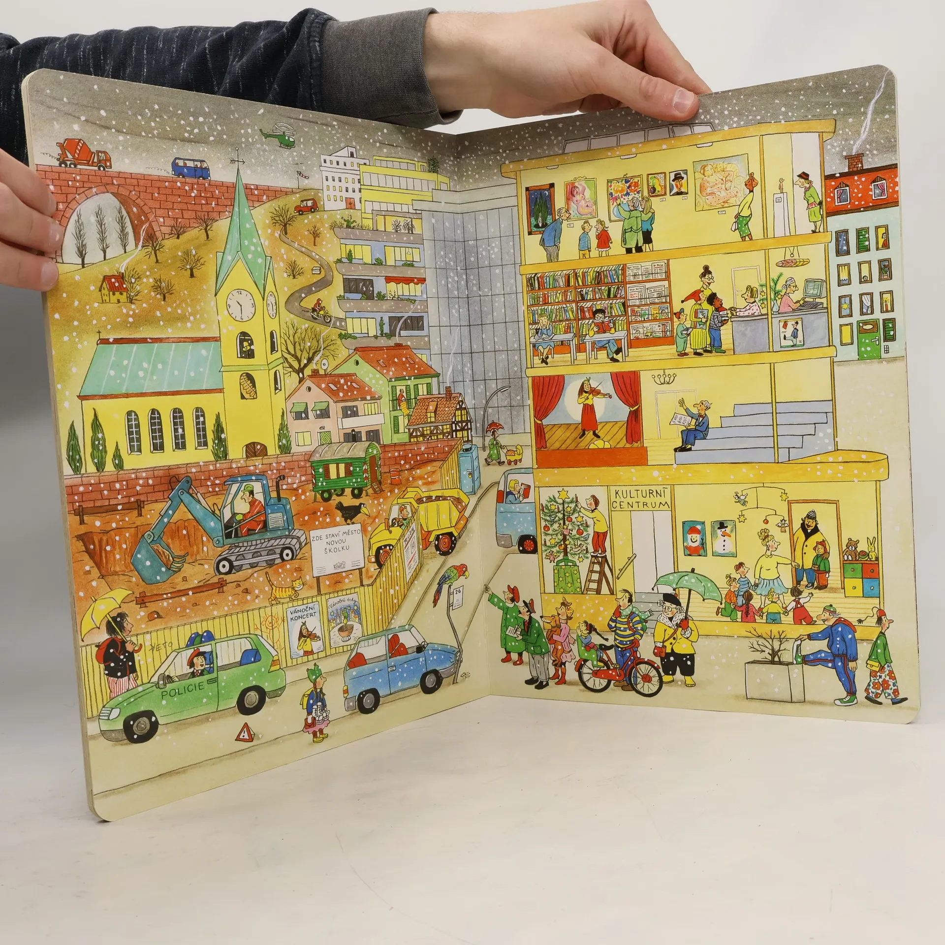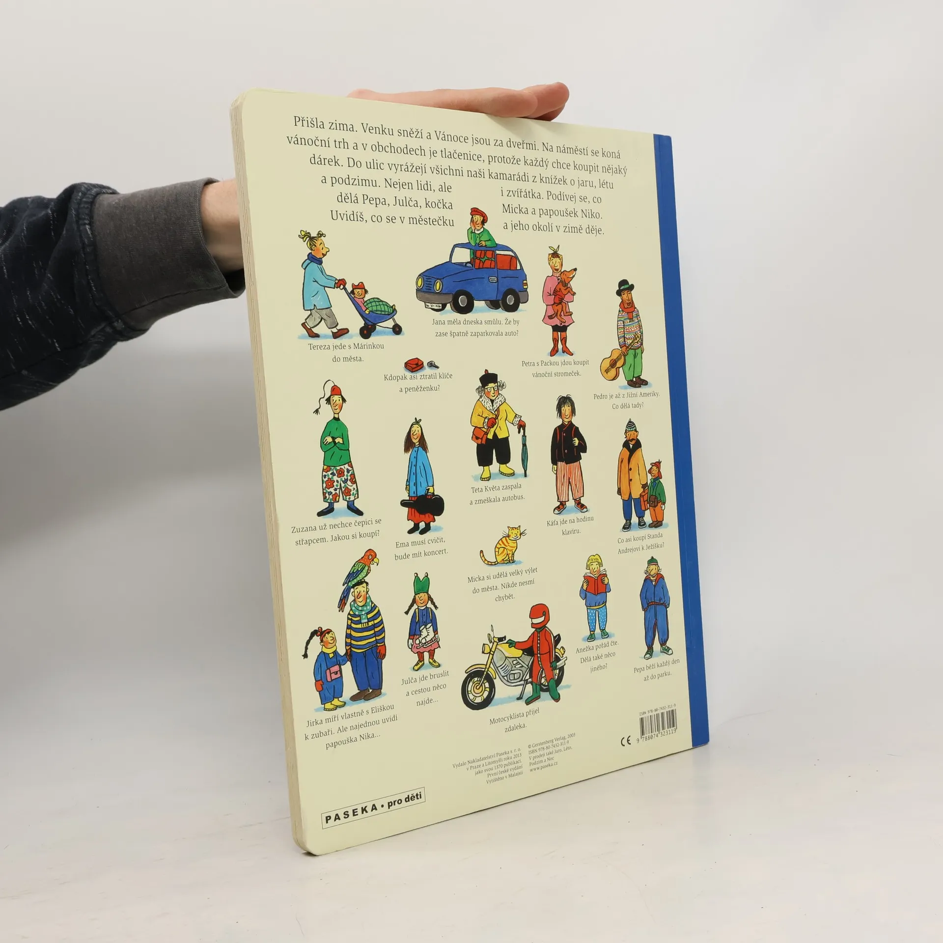 Po knížce o jaru, létu a podzimu přichází Zima. Rotraut Suzanne Bernerová na obrázcích znovu vypráví své malé, vtipné příběhy všedního dne, které poutají a bystří pozornost, podněcují fantazii a řečové schopnosti, ale hlavně baví malé i větší děti. V předvánoční atmosféře se opět setkáte s některými starými známými a kamarády z předchozích tří úspěšných knížek. Přibudou další postavy, věci a zvířátka. Jen místo zůstává stejné: město s ulicemi, domy, s tržištěm, obchody, k tomu park a nedaleký statek. Podívejte se, co všechno se v Zimě děje!