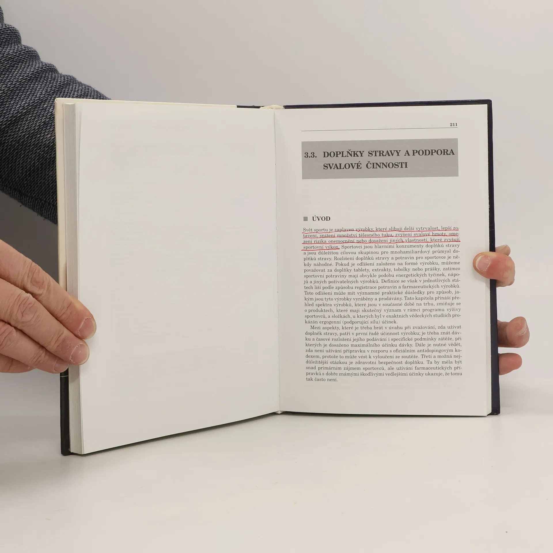 Tato příručka pro sportovní výživu je věnována fyzické zátěži a sportu a vyplývajícím požadavkům na vhodný příjem potravy. Je rozdělena do tří částí. První se zabývá problematikou vztahující se k tréninku s cílem připravit sportovce tak, aby nastoupil na startovní čáru v co nejlepší formě. Každodenní strava musí sportovci zabezpečit energii a živiny potřebné k optimalizaci jeho výkonu během tréninku a poté k rychlé obnově sil. Druhá část věnovaná výživě při závodech se zabývá vlivy stravy, které vedou k únavě nebo snižují výkon při sportovní činnosti. Řada z nich má vztah k energetické bilanci a hydrataci sportovce. Postupy, které zabraňují narušení energetické a vodní rovnováhy sportovní aktivitou, mohou omezit nebo oddálit nástup únavy, a tak zlepšit podaný výkon. Tyto strategie lze uplatňovat před, během i po závodu. Závěrečná, třetí část představuje praktickou stránku výživy sportovců a zaměřuje se na způsoby, jak lze vědecké poznatky převést do způsobu stravování a sestavení jídelníčku. Obsahuje i některá z ožehavých témat současného sportu - změnu stavby těla nebo užívání doplňků výživy k optimalizaci výkonu. Zpracováno je rovněž téma specifických potřeb u různých skupin populace nebo v různých podmínkách prostředí.