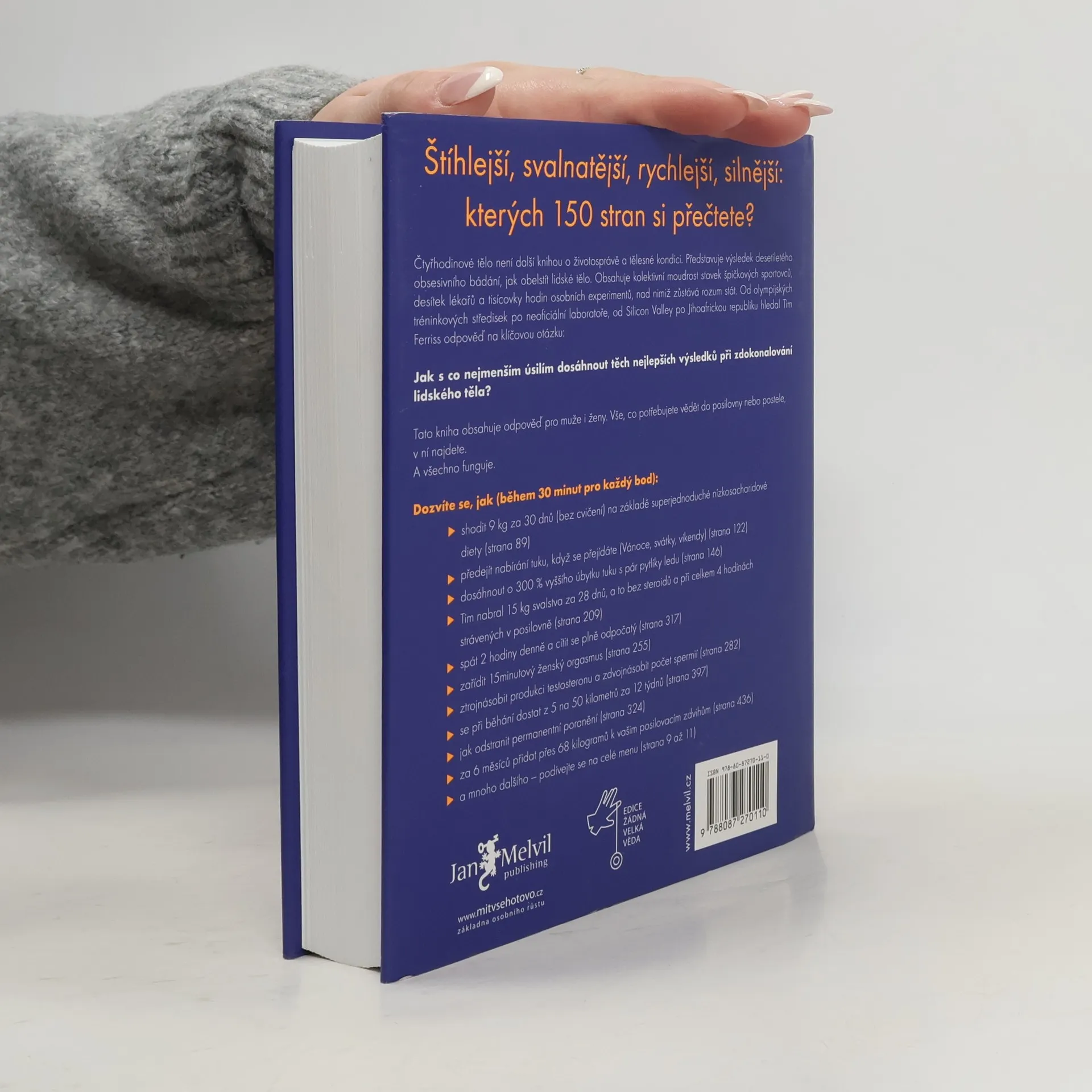 Neobvyklá cesta ke zhubnutí, zlepšení sexu a proměně v superčlověka. Pokud znáte Ferrissův úspěšný a kontroverzní "Čtyřhodinový pracovní týden", víte, že jeho nový bestseller se nebojí šlápnout do uznávaných metod hubnutí a tělesné práce na sobě. Ferriss přiznává, že většina z nás nemá dostatečnou vůli na každodenní sport a dlouhé měsíce odříkání. Nabízí propracované tipy a triky, jak dosáhnout zlepšení s menším úsilím. V knize se dozvíte, jak ženě pomoci k silnému orgasmu, zlepšit spánek či spát méně a být svěží. Ferriss vše testuje na sobě, měří výsledky a nebojí se je s námi sdílet. Tento exkluzivní návod vám prozradí: * Jak shodit 9 kg za 30 dnů (bez cvičení) na základě jednoduché nízkosacharidové diety * Jak předejít nabírání tuku během svátků * Jak dosáhnout o 300 % vyššího úbytku tuku s pár pytlíky ledu * Jak nabrat 15,5 kg svalstva za 28 dnů bez steroidů * Jak spát 2 hodiny denně a cítit se odpočatý * Jak zařídit 15-minutový ženský orgasmus * Jak ztrojnásobit testosteron a užít si sex jako pornohvězda * Jak se dostat z 5 na 50 kilometrů za 12 týdnů * Jak zvrátit trvalé následky poranění * Jak přidat přes 68 kilogramů k vašim zdvihům za 6 měsíců * Jak si zaplatit dovolenou na pláži z jedné návštěvy nemocnice.