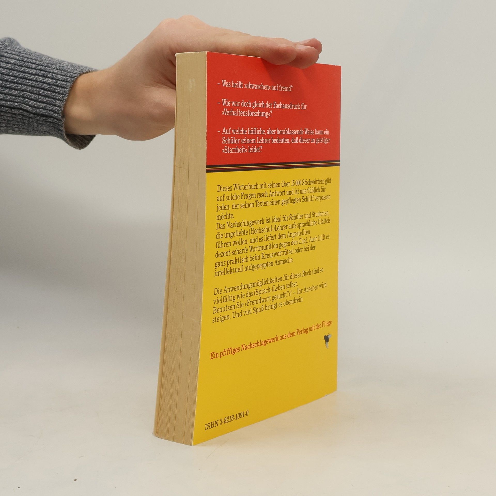 - Was heißt "abwaschen" auf fremd?- Wie war doch gleich der Fachausdruck für "Verhaltensforschung"?- Auf welche höfliche, aber herablassende Weise kann ein Schüler seinem Lehrer bedeuten, daß dieser an geistiger "Starrheit" leidet?Dieses Wörterbuch mit seinen über 15 000 Stichwörtern gibt auf solche Fragen rasch Antwort und ist unerläßlich für jeden, der seinen Texten einen gepflegten Schliff verpassen möchte.Das Nachschlagewerk ist ideal für Schüler und Studenten, die ungeliebte (Hochschul-)Lehrer aufs sprachliche Glatteis führen wollen, und es liefert dem Angestellten dezent-scharfe Wortmunition gegen den Chef. Auch hilft es ganz praktisch beim Kreuzworträtsel oder bei der intellektuell aufgepeppten Anmache.Die Anwendungsmöglichkeiten für dieses Buch sind so vielfältig wie das (Sprach-)Leben selbst.Benutzen Sie "Fremdwort gesucht?"! - Ihr Ansehen wird steigen. Und Spaß bringt es obendrein.