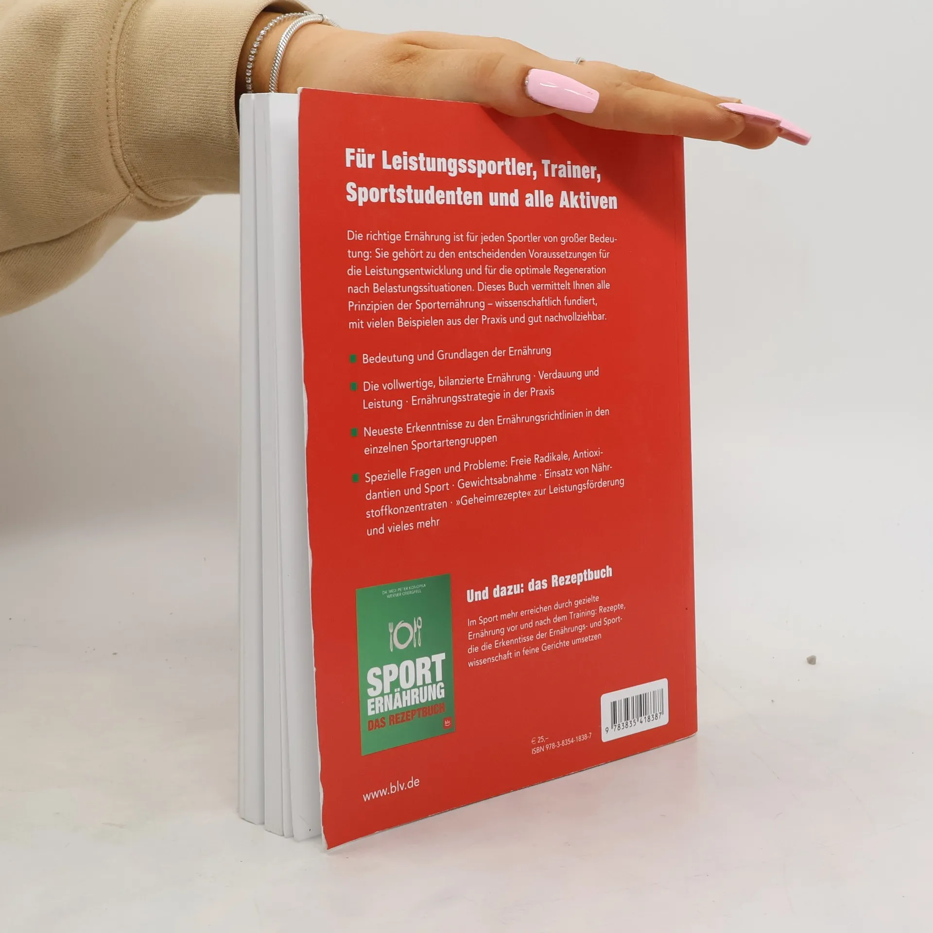 Fundiertes Basiswissen für Sportstudenten, Trainer, Übungsleiter und ambitionierte Sportler: das Richtige essen, mehr leisten. Mit neuesten wissenschaftlichen Erkenntnissen für die einzelnen Sportartengruppen von Ausdauer- bis Kraftsport. Spezielle Fragen: gezielte Gewichtsabnahme, sinnvoller Einsatz von Nährstoffkonzentraten usw.