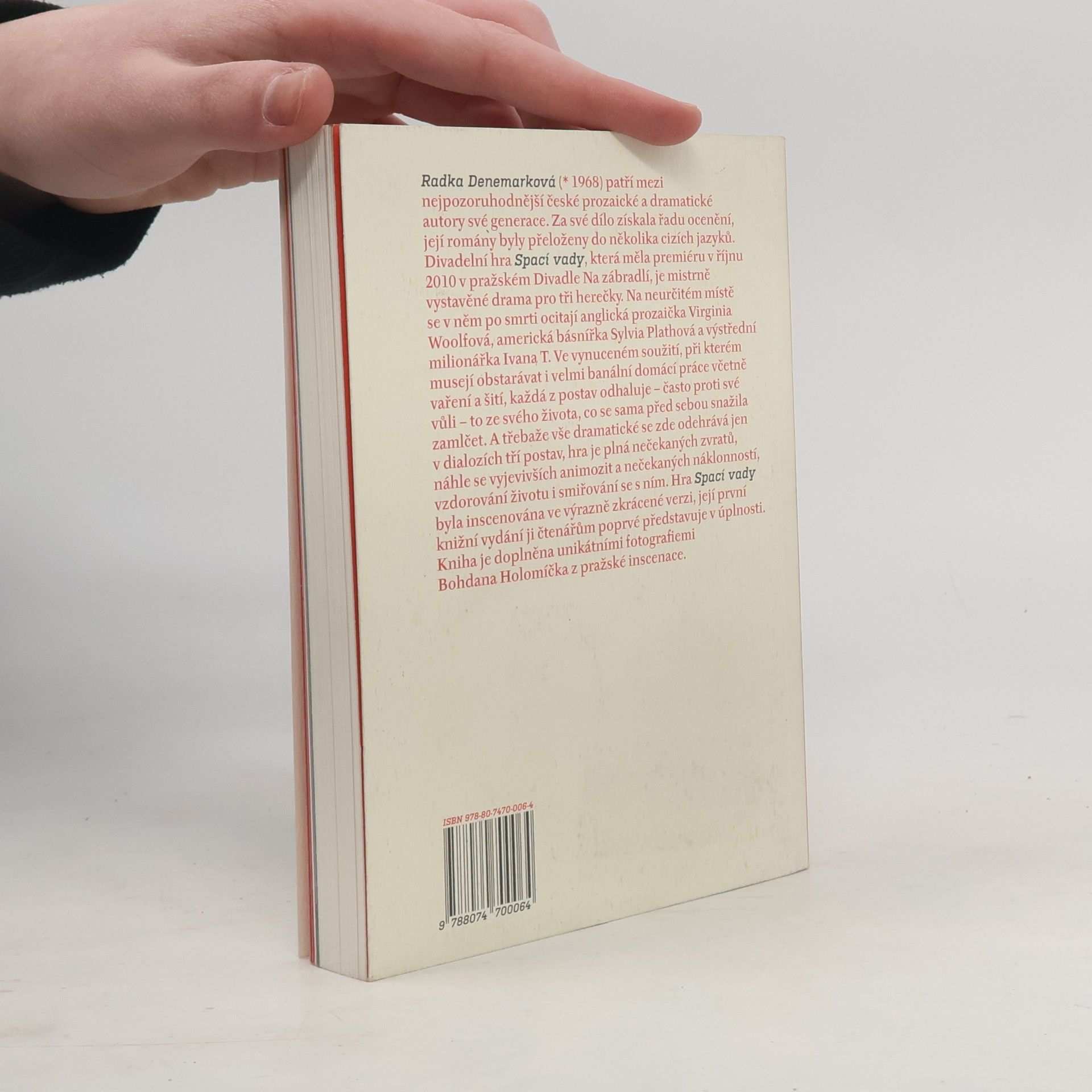 Radka Denemarková patří mezi nejpozoruhodnější české prozaické a dramatické autory své generace. Za své dílo získala řadu ocenění, její romány byly přeloženy do několika cizích jazyků. Divadelní hra Spací vady, která měla premiéru v říjnu 2010 v pražském Divadle Na zábradlí, je mistrně vystavěné drama pro tři herečky. Na neurčitém místě se v něm po smrti ocitají anglická prozaička Virginia Woolfová, americká básnířka Sylvia Plathová a výstřední milionářka Ivana T. Ve vynuceném soužití, při kterém musejí obstarávat i velmi banální domácí práce včetně vaření a šití, každá z postav odhaluje - často proti své vůli - to ze svého života, co se sama před sebou snažila zamlčet. A třebaže vše dramatické se zde odehrává jen v dialozích tří postav, hra je plná nečekaných zvratů, náhle se vyjevivších animozit a nečekaných náklonností, vzdorování životu i smiřování se s ním. Hra Spací vady byla inscenována ve výrazně zkrácené verzi, její první knižní vydání ji čtenářům poprvé představuje v úplnosti. Kniha je doplněna unikátními fotografiemi Bohdana Holomíčka z pražské inscenace. zdroj: www.kosmas.cz