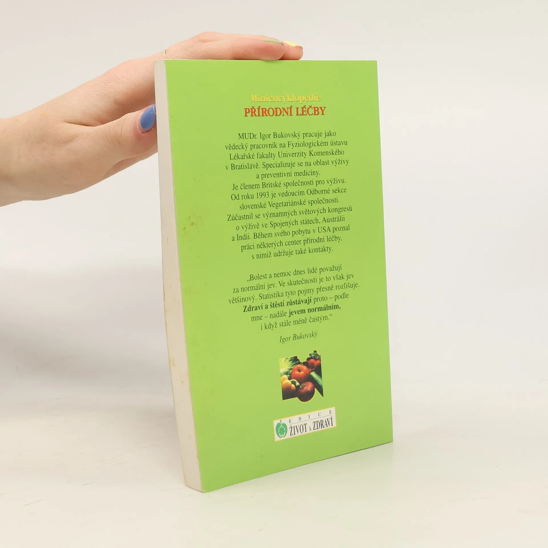 Igor Bukovský. MUDr. Igor Bukovský je odborným asistentem a vědeckým pracovníkem Fyziologického ústavu Lékařské fakulty v Bratislavě. Výživou a preventivním lékařstvím se zabývá od roku 1990. Od r. 1991 se pravidelně účastní všech významných evropských a světových kongresů o výživě a fyziologii člověka. Od r. 1990 veřejně přednáší a publikuje. Je autorem řady rozhlasových a televizních pořadů a novinových článků. Napsal knihy Hledá se zdravý člověk a Vegetariánské dítě. Je členem Britské společnosti pro výživu, Americké společnosti pro klinickou výživu a několika domácích odborných společností. Výzkumná práce dr. Bukovského je zaměřena na vliv oxidací a antioxidantů na raná stadia aterosklerózy. Knížka chce být přehledným a stručným návodem, jak léčit některá častá onemocnění - stravou, úpravou stylu života, bylinkami a zeleninovými šťávami nebo u nás ještě málo známou vodoléčbou. Ze slovenského originálu "Miniencyklopédia prírodnej liečby" přeložila Marta Bártová. Foto MICHAEL PHOTOBANK. Vydání třetí.