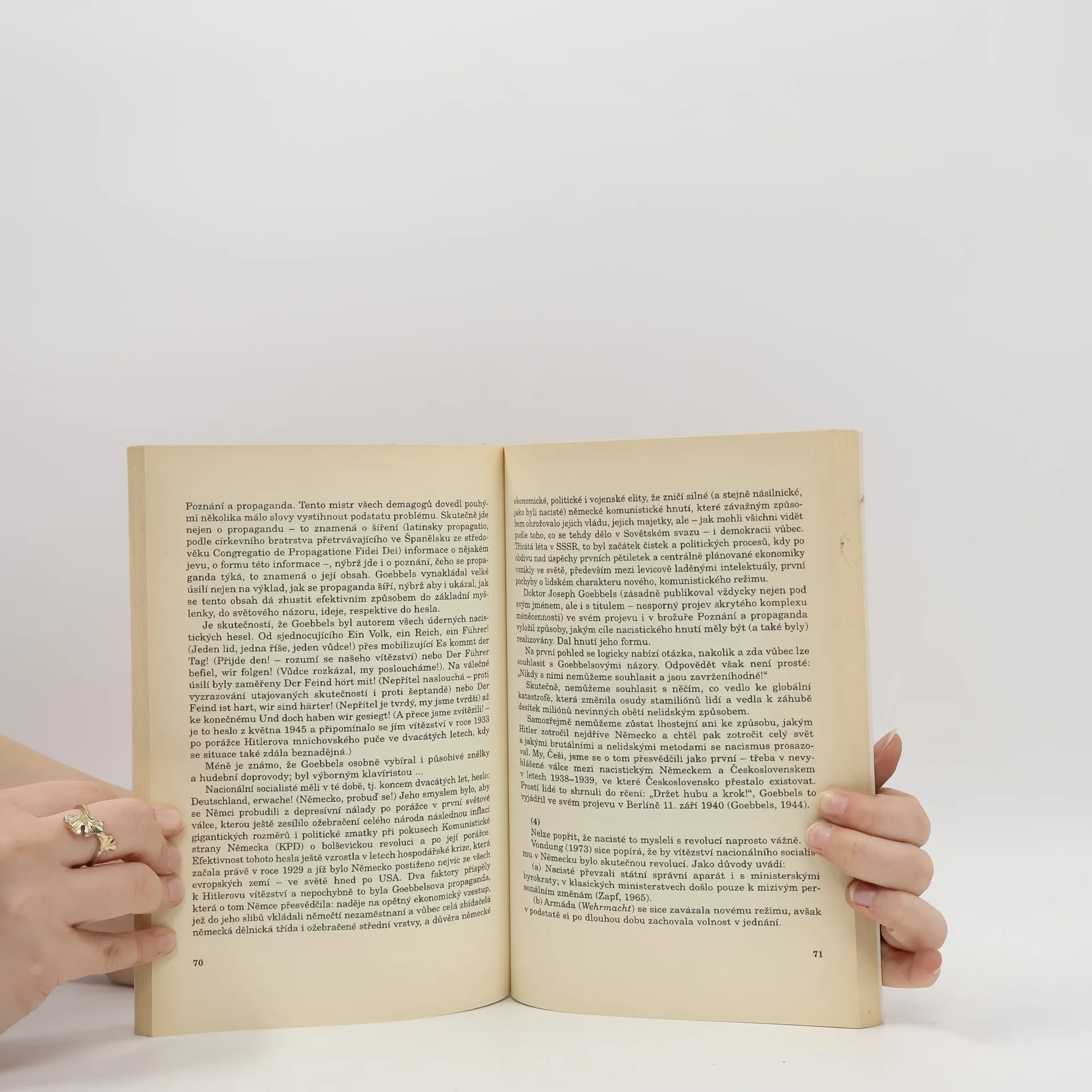 Komentovaný překlad vybraných projevů. Vybrané projevy dr. Josepha Goebbelse, jednoho z Hitlerových nejvěrnějších spolupracovníků, přinášející v konfrontaci s Duffackovým komentářem nevšední pohled na "kulhavého ďábla", jemuž je (mylně) připisován výrok, že pravda je mnohokrát opakovaná lež. Zvláště pozoruhodné je hodnocení říšského ministra národní osvěty a propagandy v souvislosti se současnou úlohou masových sdělovacích prostředků... Vymývání mozků totiž nezačalo ani neskončilo nacistickou érou, jak je toho Duffack důkazem.