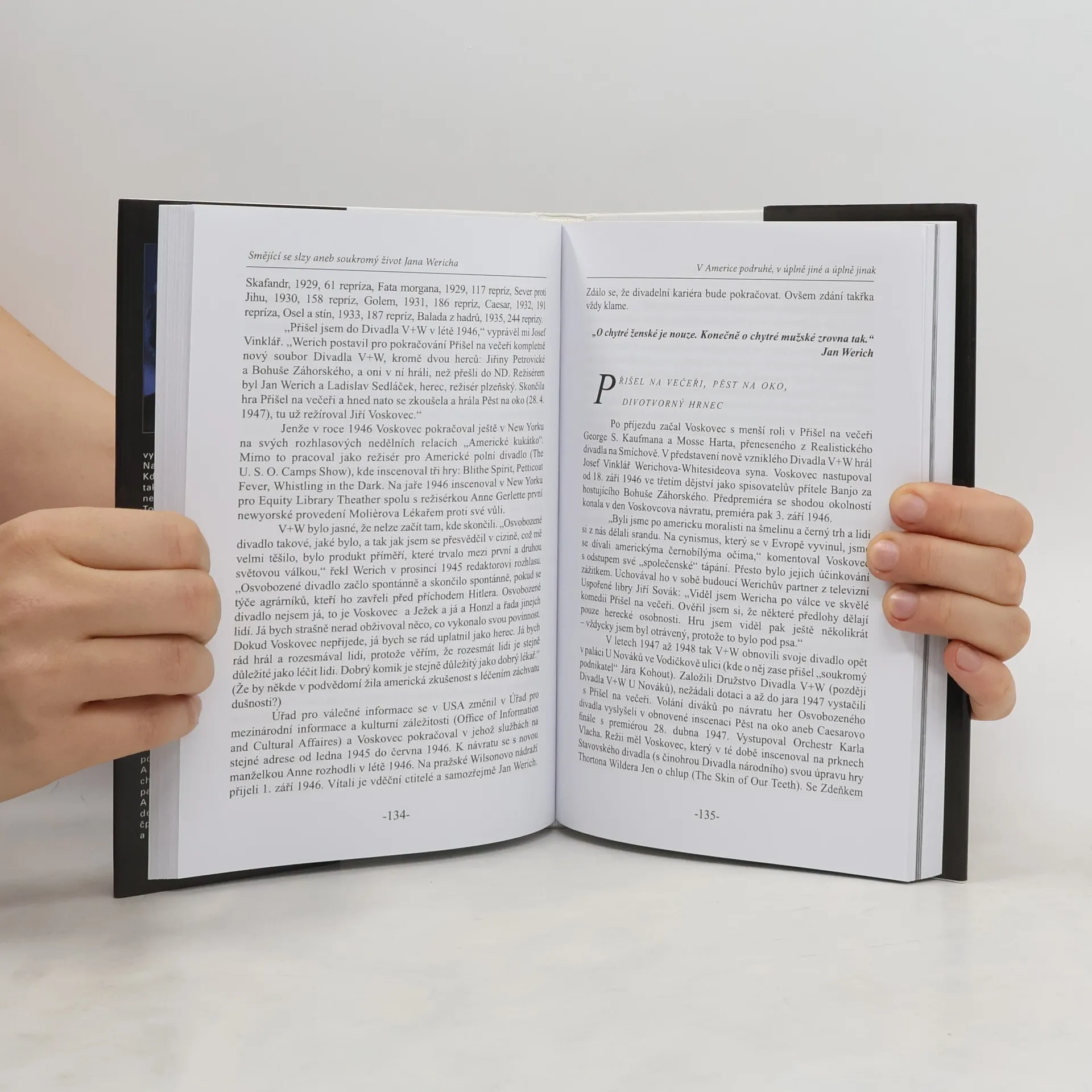 Kniha obsahuje dosud nepublikované výňatky z osobní korespondence a dokumenty, které pravdivě osvětlují nejen předválečné i poválečné vztahy s Jiřím Voskovcem, ale i okolnosti některých jeho kroků, o nichž se hodně diskutovalo, například spoluúčast na podpisu anticharty. Kniha prostřednictvím výpovědí jeho přátel rozkrývá složité osobní vztahy Jana Wericha, které bývaly pro veřejnost obvykle tabu.... celý text